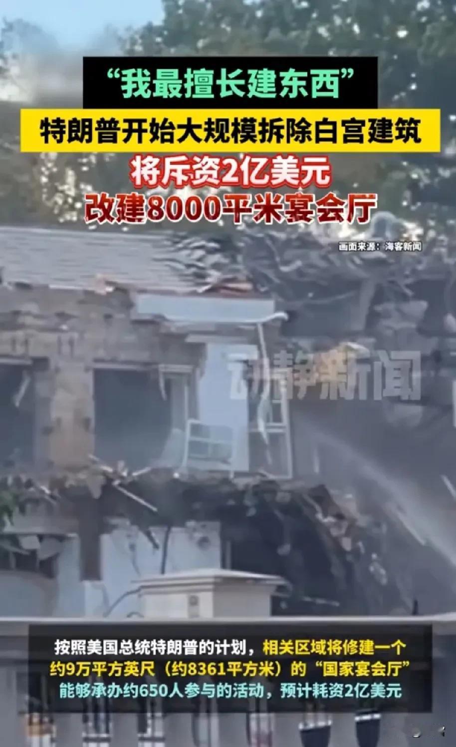 哪吒打量着玉虚宫, 感叹其洁白, 同时对特朗普的改建计划感到新奇, 想象新白宫可能会有怎样的奢华设施。 特朗普拆除白宫东翼, 那是建于1902年的建筑, 因嫌宴会空间狭小, 无法满足现代白宫的社交与外交需求。他改建约8361平方米的“国家宴会厅”, 可容纳650多人, 旨在打造更现代化、功能更齐全的国家级接待场所。 施工在政府停摆期间持续进行。 特朗普坚称停摆与改建无关, 而希拉里批评他将白宫视为私人资产, 认为其行为模糊了公私界限, 损害了政府的公共性。 这场改建计划引发了关于白宫改建权、政府运作与私人资金介入的广泛争议,反映了美国政治中的矛盾与价值观冲突。 特朗普宴会厅 白宫总统办公室 白宫宴会厅 特朗普楼 白宫拆除 图片来源于视频截图