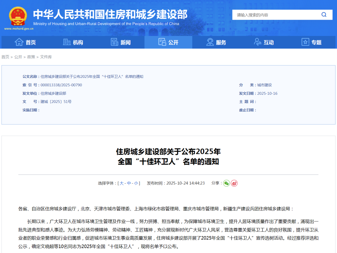 住建部公布2025年全国“十佳环卫人”名单