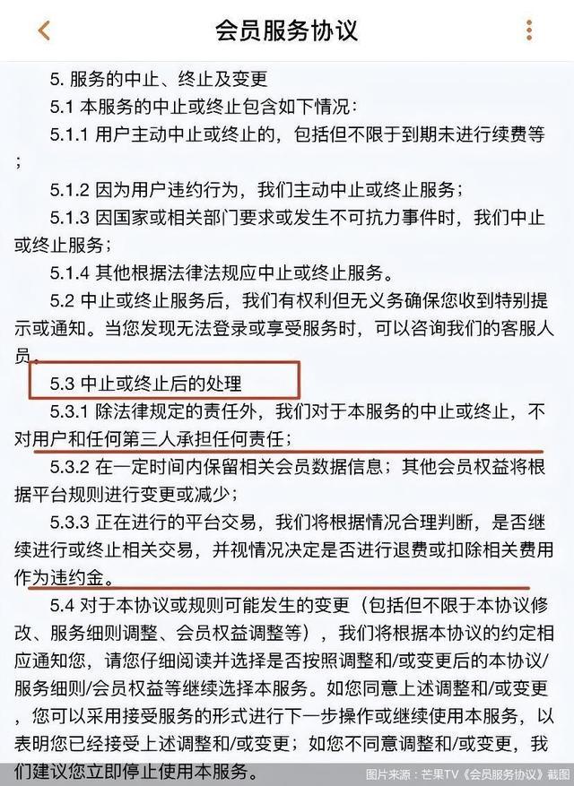 据芒果TV《会员服务协议》(以下简称《协议》),在“服务的中止、终止及变更”部分的“中止或终止后的处理”提及,除法律规定的责任外,平台对于服务中止或终止,不对用户和任何第三人承担任何责任;正在进行的平台交易,将根据情况合理判断,是否继续进行或终止相关交易,并视情况决定是否进行退费或扣除相关费用作为违约金。