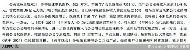 上述报告还提及,会员业务的快速增长,既得益于芒果TV持续、稳定的优质内容供给,也得益于不断创新的会员权益体系。一方面,以《歌手2024》《再见爱人4》为代表的爆款综艺和以《小巷人家》《与凤行》为代表的热门剧集,有力拉动会员规模的快速增长;另一方面,全面升级会员权益体系,推出高阶会员专属权益,构建IP定制节目、单点直播、剧综联动、超前售后四大增收矩阵,创新《歌手2024》全民预测直播、《跨年晚会》多视角直播等会员互动产品,提高用户价值感知和付费意愿,稳步提升ARPPU值。