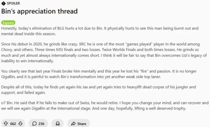 在昨日BLG淘汰后,国外Bin的粉丝在发帖引发热议,部分内容如下。