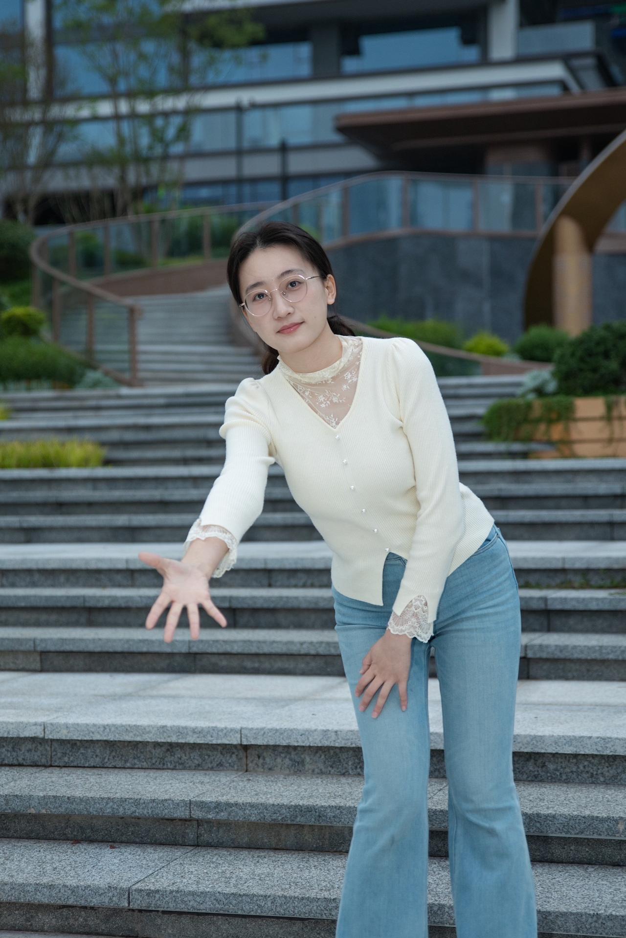阳光下的清新少女,蓝白相间的穿搭,自然背景下的美好瞬间。