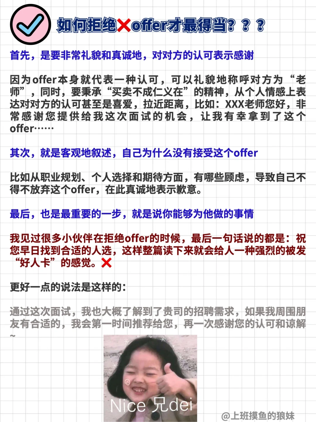 我见过很多小伙伴在拒绝offer的时候,最后一句话说的都是:祝您早日找到合适的人选,这样整篇读下来就会给人一种强烈的被发“好人卡”的感觉。