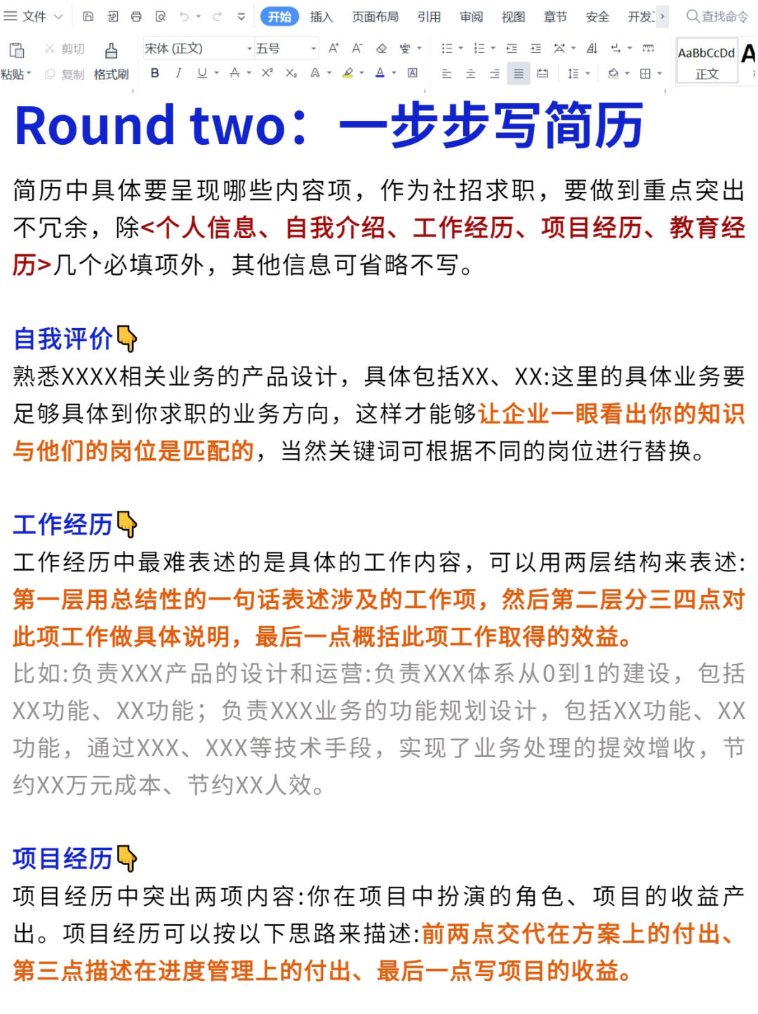 🔸主要从自我评价、工作经历、项目经历几方面产出,要做到重点突出不冗余。