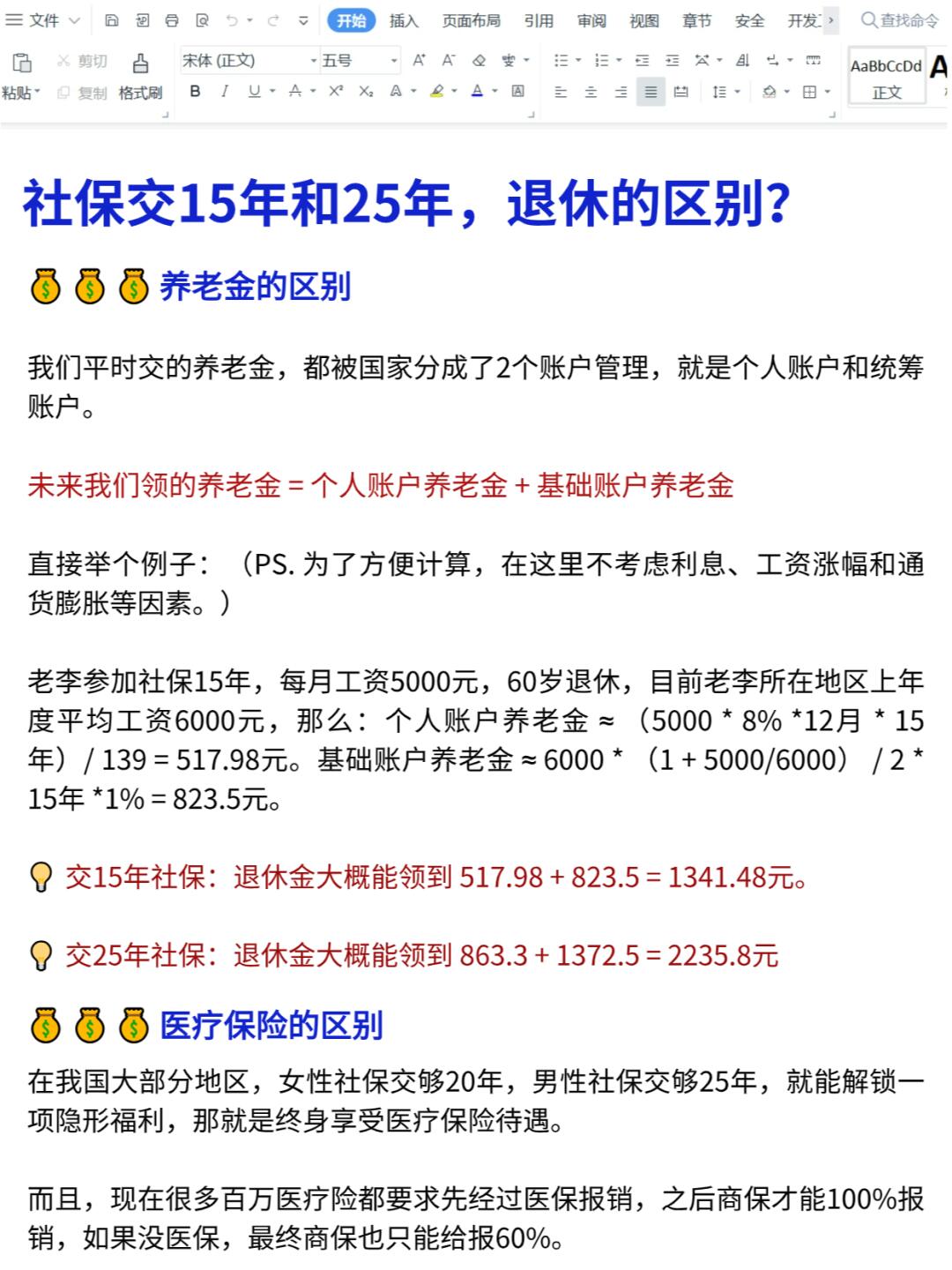 ❗而终身享受医保待遇,男性要缴满25年,女性要缴满20年,也就是说,你只交15年社保,是不享受医保待遇的。