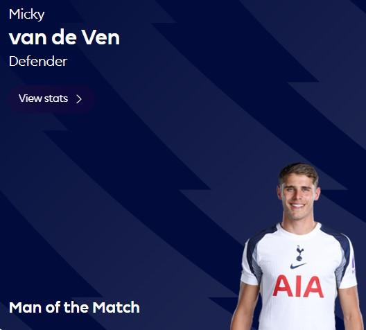 英超官方宣布范德芬当选本场比赛球迷票选全场最佳球员。