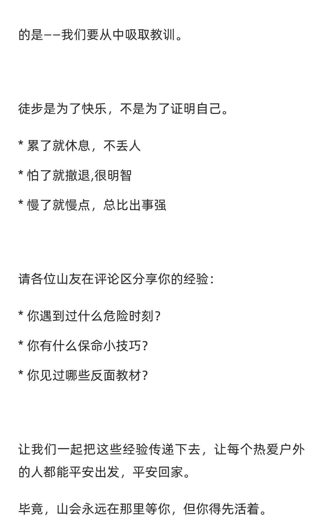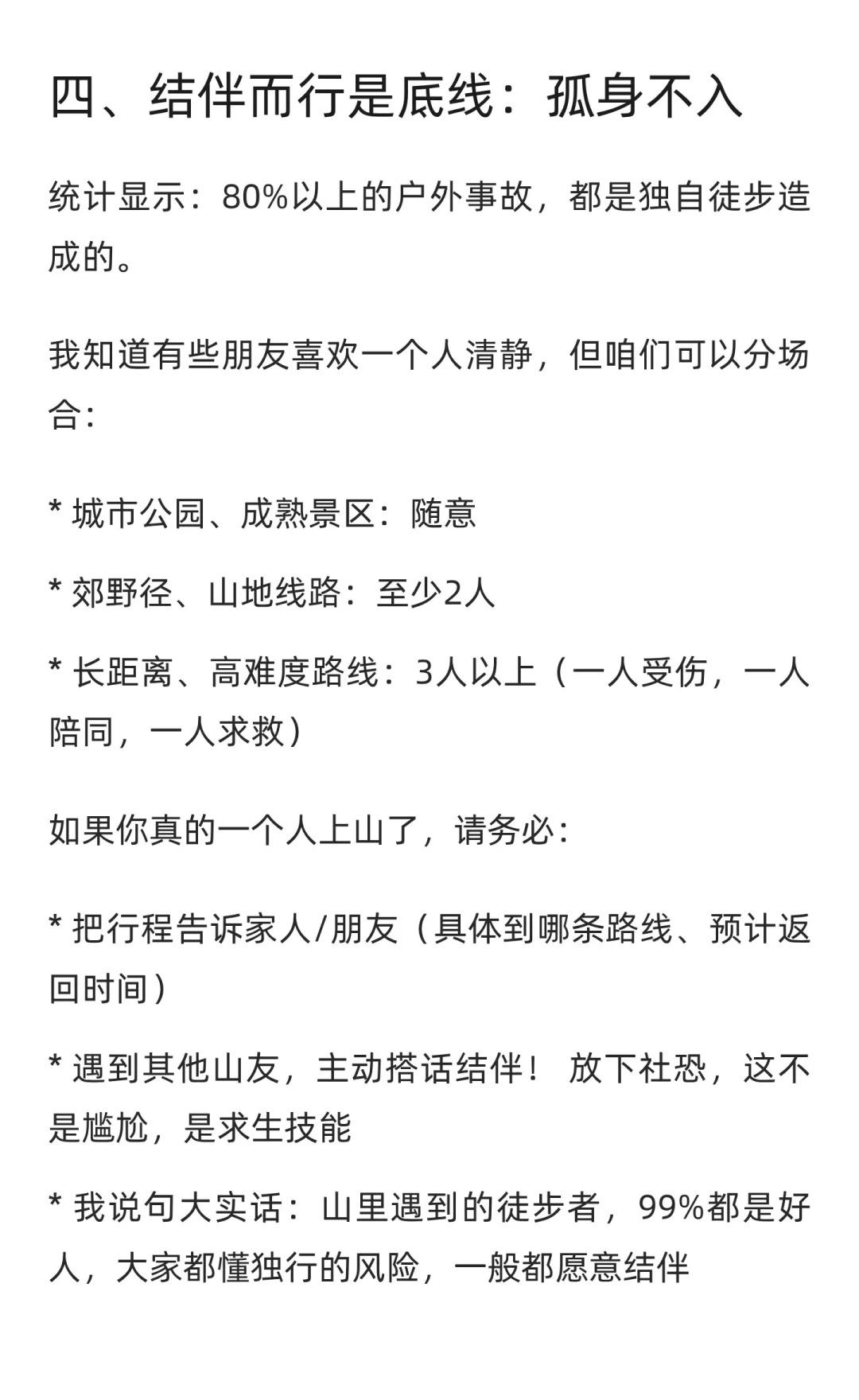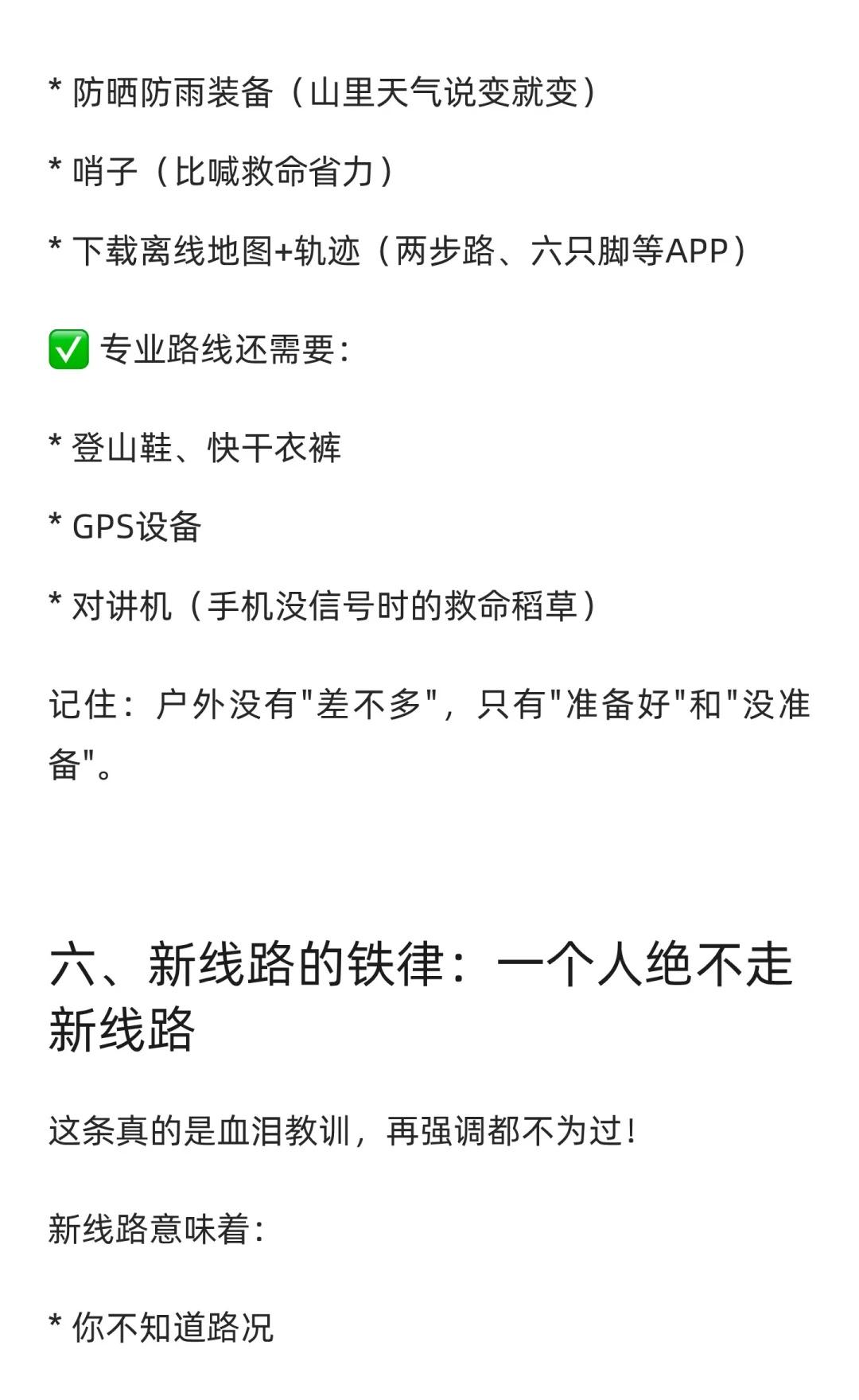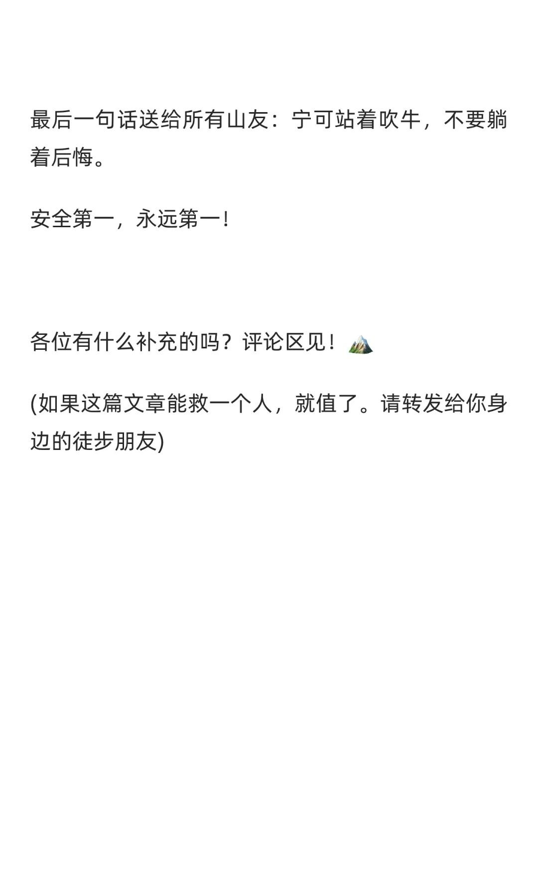 徒步老驴的保命经验,每一条都是血的教训 徒步圈 交换旅途故事 户外徒步 徒步丈量世界 户外安全意识 年轻人徒步 你要写徒步就不能只写徒步 越野跑人的至暗时刻 户外有风险爬山需谨慎 徒步的意义 山永远在,命只有一次 望郎归这几起事故,每一起都让人心痛。他们也许是准备不足,也许是运气不好,但最重要的是——我们要从中吸取教训。 徒步是为了快乐,不是为了证明自己。 累了就休息,不丢人 怕了就撤退,很明智 慢了就慢点,总比出事强 请各位山友在评论区分享你的经验: 你遇到过什么危险时刻? 你有什么保命小技巧? 你见过哪些反面教材? 让我们一起把这些经验传递下去,让每个热爱户外的人都能平安出发,平安回家。 毕竟,山会永远在那里等你,但你得先活着。 最后一句话送给所有山友:宁可站着吹牛,不要躺着后悔。安全第一,永远第一! 各位有什么补充的吗?评论区见!🏔️ (如果这篇文章能救一个人,就值了。请转发给你身边的徒步朋友)