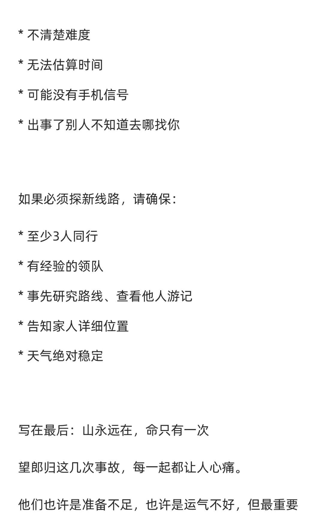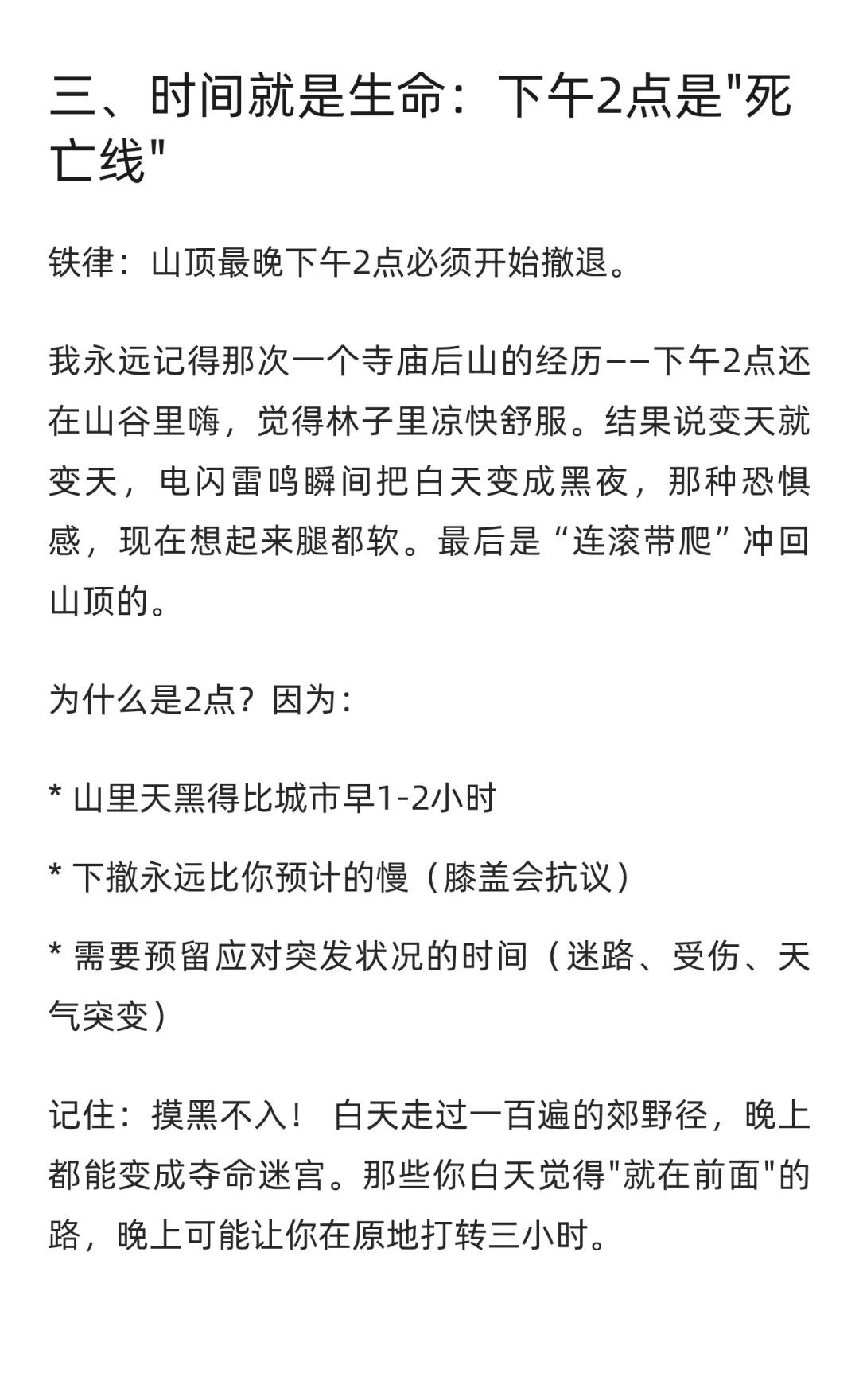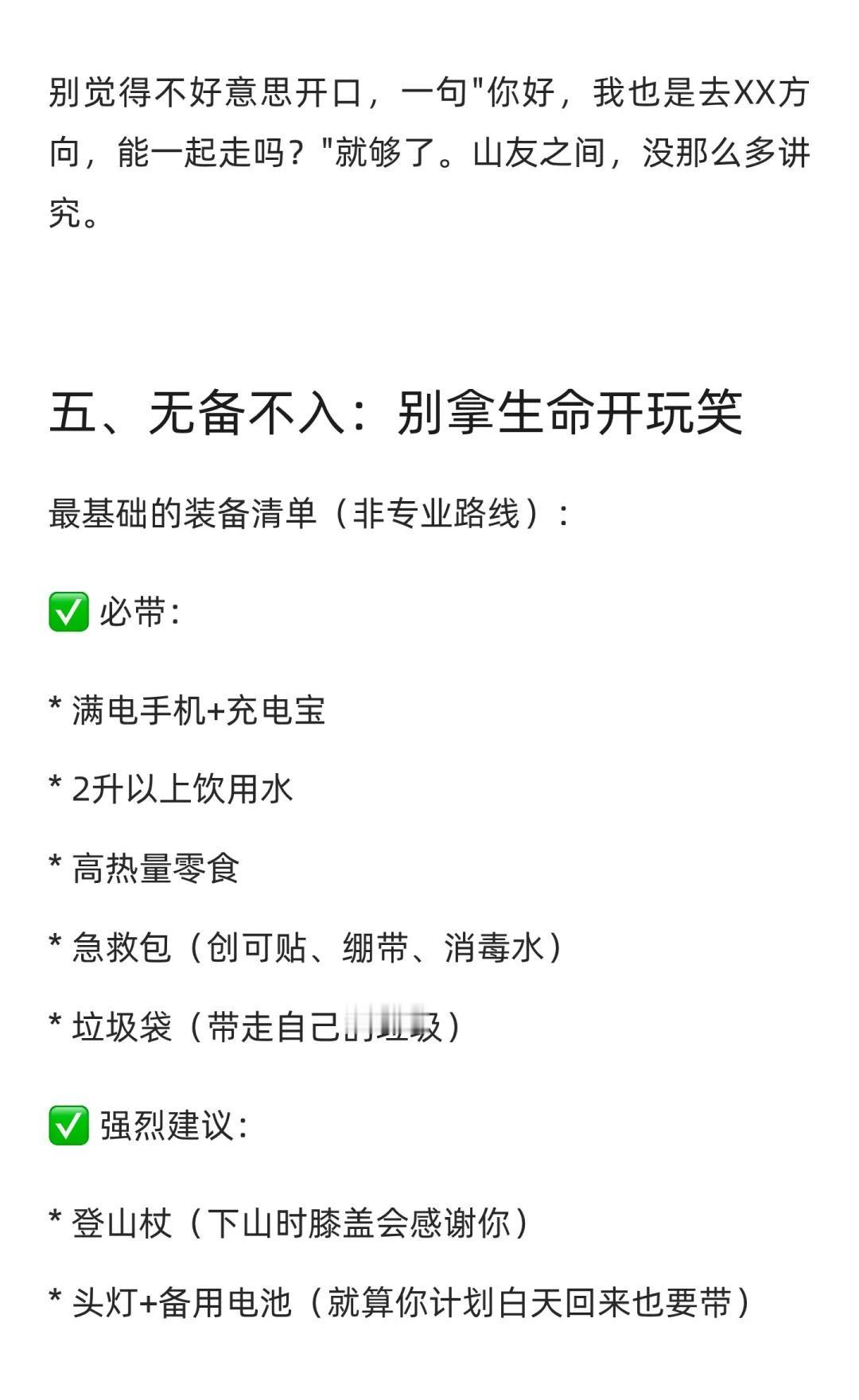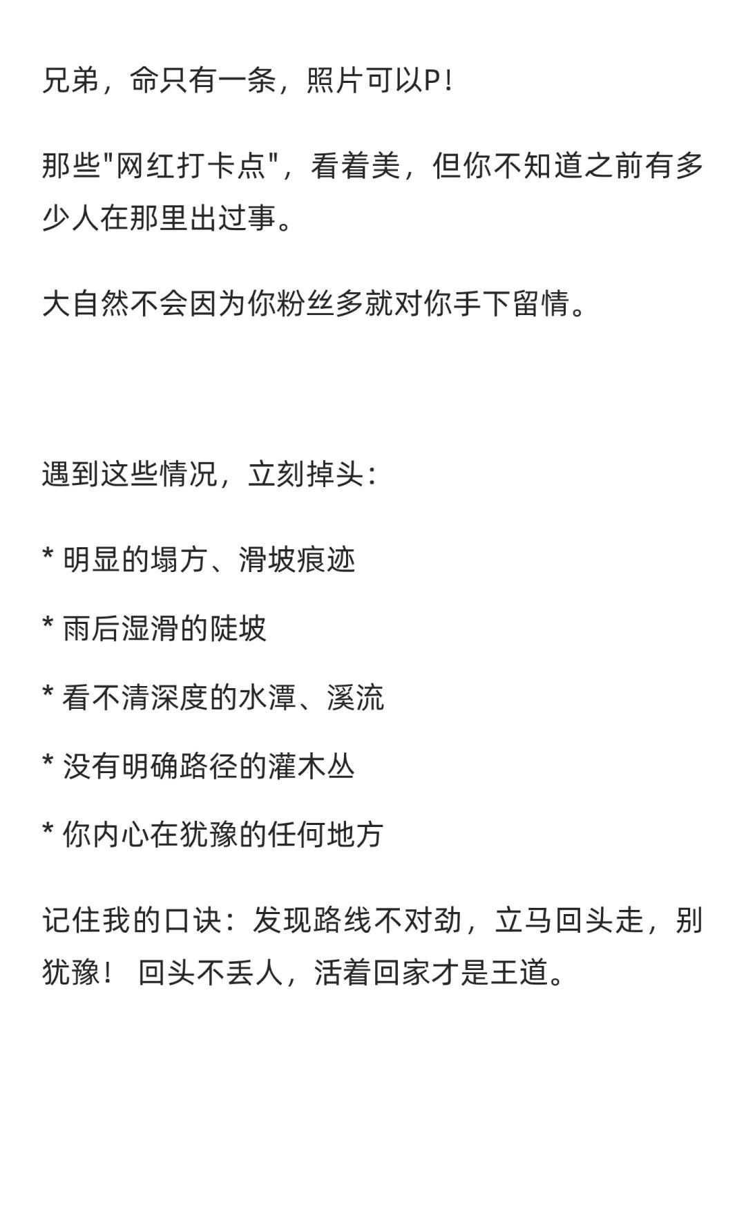 徒步老驴的保命经验,每一条都是血的教训 徒步圈 交换旅途故事 户外徒步 徒步丈量世界 户外安全意识 年轻人徒步 你要写徒步就不能只写徒步 越野跑人的至暗时刻 户外有风险爬山需谨慎 徒步的意义 山永远在,命只有一次 望郎归这几起事故,每一起都让人心痛。他们也许是准备不足,也许是运气不好,但最重要的是——我们要从中吸取教训。 徒步是为了快乐,不是为了证明自己。 累了就休息,不丢人 怕了就撤退,很明智 慢了就慢点,总比出事强 请各位山友在评论区分享你的经验: 你遇到过什么危险时刻? 你有什么保命小技巧? 你见过哪些反面教材? 让我们一起把这些经验传递下去,让每个热爱户外的人都能平安出发,平安回家。 毕竟,山会永远在那里等你,但你得先活着。 最后一句话送给所有山友:宁可站着吹牛,不要躺着后悔。安全第一,永远第一! 各位有什么补充的吗?评论区见!🏔️ (如果这篇文章能救一个人,就值了。请转发给你身边的徒步朋友)