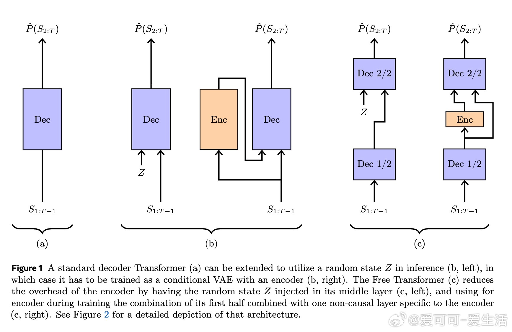 传统Decoder Transformer通过自回归方式生成序列,逐步预测下一个token,所有决策仅基于已生成的token,缺少显式的潜变量建模。Free Transformer引入无监督学习的随机潜变量Z,借助条件变分自编码器(Conditional VAE)框架,使生成过程可显式依赖于潜变量,从而捕获序列更丰富的结构信息。