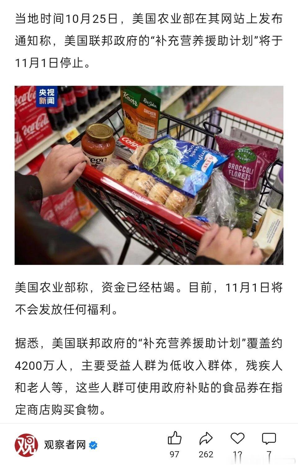 🔻11月1日后,美国4200万名低收入群体,残疾人和老人将无法从美国的“补充营养援助计划”获得食品援助。怎么办?饿肚子?[哆啦A梦吃惊][哆啦A梦吃惊]