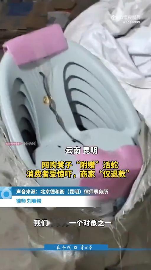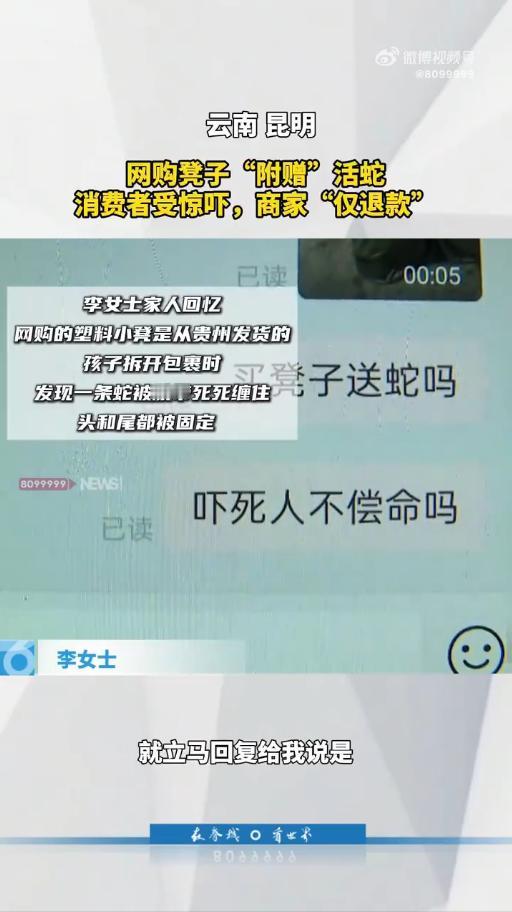 “严查到底!”10月23日云南昆明,一女子网购塑料凳,到货后孩子拿回家拆开检查,结果竟发现一条活蛇被人用胶带缠在凳上!可当女子联系商家时,对方根本没有调查,仅仅只是把钱退了就再无消息。网友:一看就是故意的![作揖] 取个快递本应是件高兴事,可昆明李女士一家最近却因此受了不小的惊吓,几天前她在网上订购的塑料板凳到货了由孩子代收。 没想到两个孩子兴冲冲地拆开包装后,竟发现一条活生生的蛇被胶带牢牢缠在凳子腿上,还在不停扭动,孩子当场被吓哭,家里老人闻声赶来,最后是用火钳才把蛇清理掉。 李女士得知情况后,立刻选择了报警,并联系了售卖板凳的网店客服,商家的回应让她更加困惑。 对方没有询问任何细节,也没有表示会内部核查,只是简单否认了是他们所为,随后办理了退款,便再无音讯。 退款即终结的处理方式,让李女士难以接受,她表示将通过法律途径继续维权。 此事一出,瞬间点燃了网友们的讨论,大家的态度几乎一边倒。 “我的天拆快递拆出蛇来,这简直是恐怖片剧情,要是我可能当场就晕过去了,商家一句解释没有就退款,明显是心里有鬼。” “这种情况必须追究到底,支持这位妈妈走法律程序,今天能拆出蛇,明天指不定能拆出什么,太吓人了。” “我猜是仓库的问题,可能蛇是自己爬进去的,但用胶带缠住这点太可疑了,绝对是人为的,细思极恐。” “作为两个孩子的家长,看到这个新闻后背发凉,孩子们肯定留下心理阴影了,这已经不是简单的售后问题必须严查。” “说实话现在网购监管还是太松了,特别是这些小商家,出事了就玩消失,平台应该负起责任来。” “我在想是不是恶意竞争,会不会是有人故意放进去陷害商家的,不过无论如何商家这个态度都很不负责任。” “去年我买衣服还拆出过死蟑螂,当时恶心得直接退货了,现在想想都后怕,以后拆快递真要戴手套了。” “快递环节也有可能啊,经过这么多人手,谁知道哪个环节出了问题,但用胶带固定这点,明显是打包时的问题。” “这种商家必须曝光店名,让大家都避避雷,不能让他继续卖货害人太缺德了。” “说起来你们可能不信,我上次买水果拆出一条蜈蚣,还好当时没被咬到,现在网购真是开盲盒,什么都有可能。” “平台应该建立黑名单制度,这种出过严重问题的商家永久封店,不然换个马甲又继续开店防不胜防。” “我觉得应该报警处理,这已经涉及公共安全了,万一是有毒蛇怎么办,后果不堪设想。” “作为经常网购的人,看完这个新闻我默默下单了拆快递神器,安全第一以后还是小心点为好。” “商家连调查都不做就退款,明显是想息事宁人,这种态度更让人怀疑,必须深挖到底。” “说实话现在很多人靠网购生活,出现这种事真的让人很不安,希望平台能加强监管,给我们消费者一个交代。” “我比较好奇的是,蛇是怎么活下来的,在路上这么多天不需要吃喝吗,这点真的很奇怪。” “建议所有商家都在包装环节安装监控,这样出了问题也能自证清白,现在这样各说各话,根本搞不清责任。” “上次我买的孩子玩具里有个刀片,还好发现得早,现在给孩子买东西都提心吊胆的,这些商家太没良心了。” “这件事最让人生气的是商家的态度,连句道歉都没有,出了问题不可怕,可怕的是这种敷衍了事的态度。” “作为法律从业者,我要说这种情况完全可以要求精神损害赔偿,特别是对孩子造成了惊吓,不能就这么算了。” 您在网购时有没有遇到过什么意想不到的情况?对于如何更好地保障网购安全,您有什么好建议?欢迎在评论区分享您的经历和看法。 信息来源:中国新闻周刊