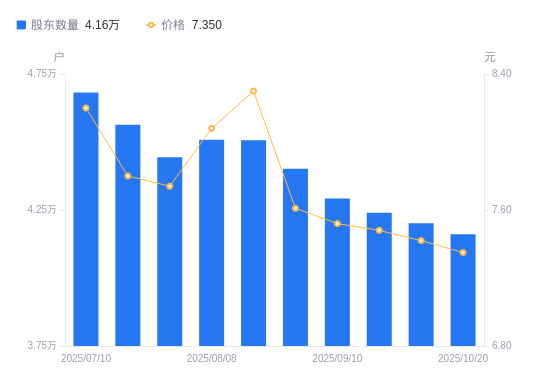 日期A股户数(户)流通A股户均持股数(股)户均持股市值(万元)2025-10-204160613219.049.722025-09-304200913092.239.712025-09-194240212970.889.702025-09-104292712812.259.632025-08-294401412495.839.512025-08-204506812203.5910.132025-08-084508112200.079.862025-07-314443512377.439.582025-07-184563812051.179.402025-07-104682111746.689.63