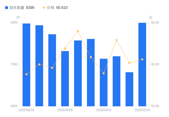 日期A股户数(户)流通A股户均持股数(股)户均持股市值(万元)2025-10-2083992243.2613.602025-09-3074522528.3415.222025-09-1977572428.9215.282025-09-1077112443.4114.402025-08-2980892329.2314.182025-08-2080602337.6114.962025-08-0878582397.7014.842025-07-3181792303.6013.732025-07-1883522255.8913.542025-06-3083852247.0113.22