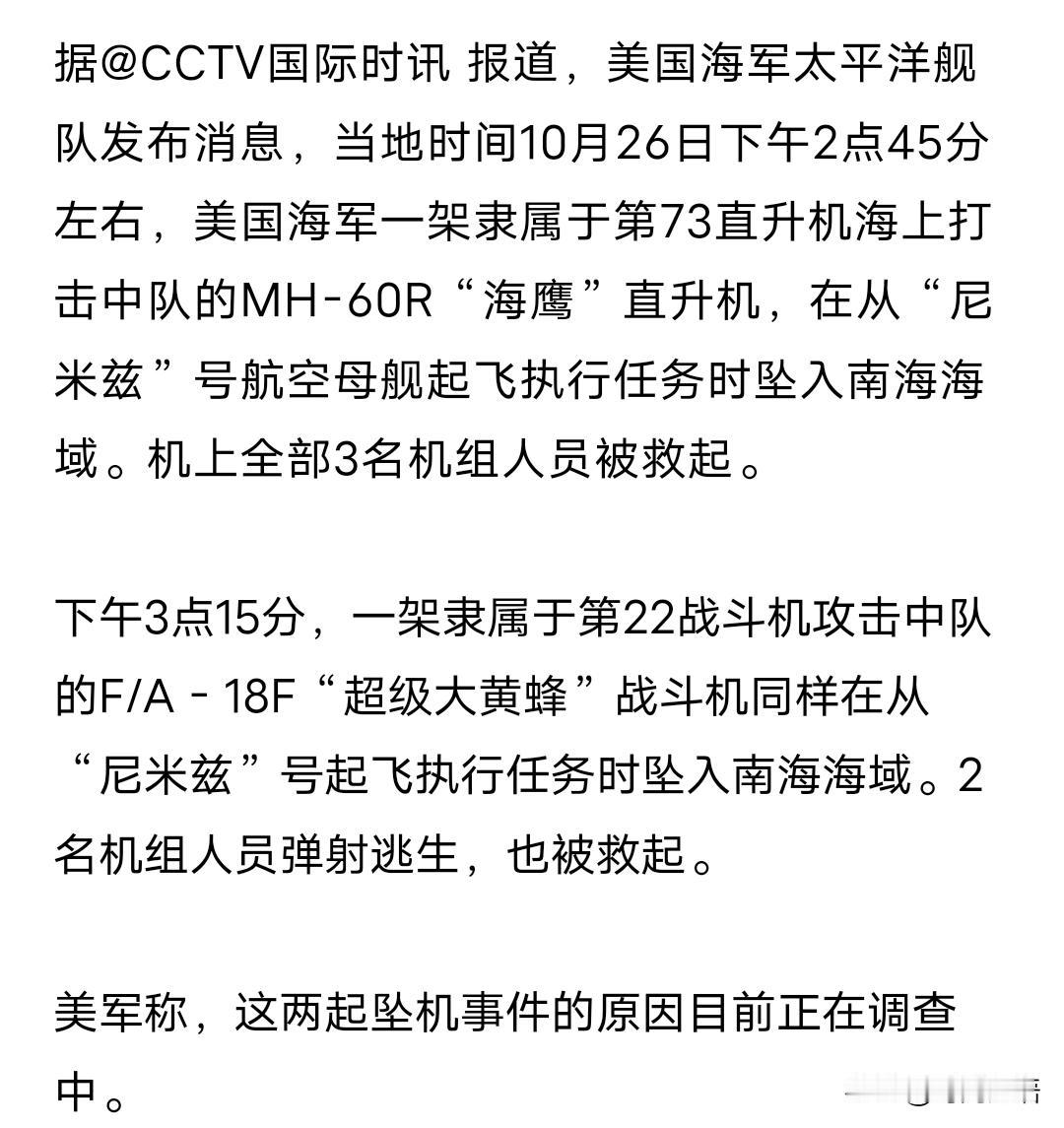 大侄子们又低估了主子,在盛赞美军强大的救援能力时,它们根本想不到坠机是美军下的一盘大棋。 26日不到半小时美军两架舰载机坠入南海,评论区大侄子们立刻感叹飞行员和机组人员无一遇难,全部被打捞生还。 事情远没有救援能力强那么简单,其实这是美军长远规划的一部分,有两个核心是在下一盘大棋。 一是在同一个区域坐标点连续坠机或沉舰,日积月累就会堆成一个小岛,就像菲律宾的坐滩船一样,那个区域就存在美国资产,最好再沉一艘航母,然后就可以宣布这片海域属于美国了。 二是美军是在南海开展军机坠海演练,检验不同型号军机坠海时水花高度和飞行员逃生性能及打捞时长,并借机在南海搞水域研究。 这是不是一盘大棋?后续也许会有第三架、第四架、第五架……