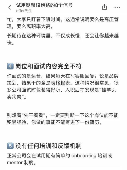 很多人在试用期的心态都是“好不容易进来,先熬过试用期再说”,但试用期应该是个双向筛选的过程,“熬”其实是在浪费自己的时间。 . 在这个阶段公司在看你适不适合,你也应该判断判断这家公司值不值得留下。 . ✅这8个信号,如果中了两三条,真的要考虑及时止损。 . 一个认真分享“找工作”干货的账号。真诚、有料、不说空话,只想用真实经历、具体方法,帮大家少走点弯路 .