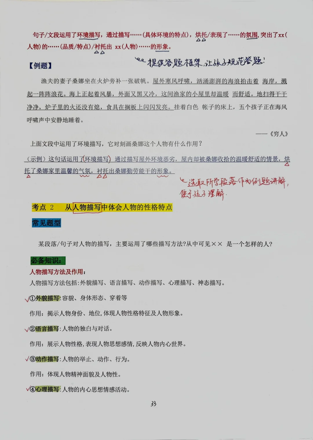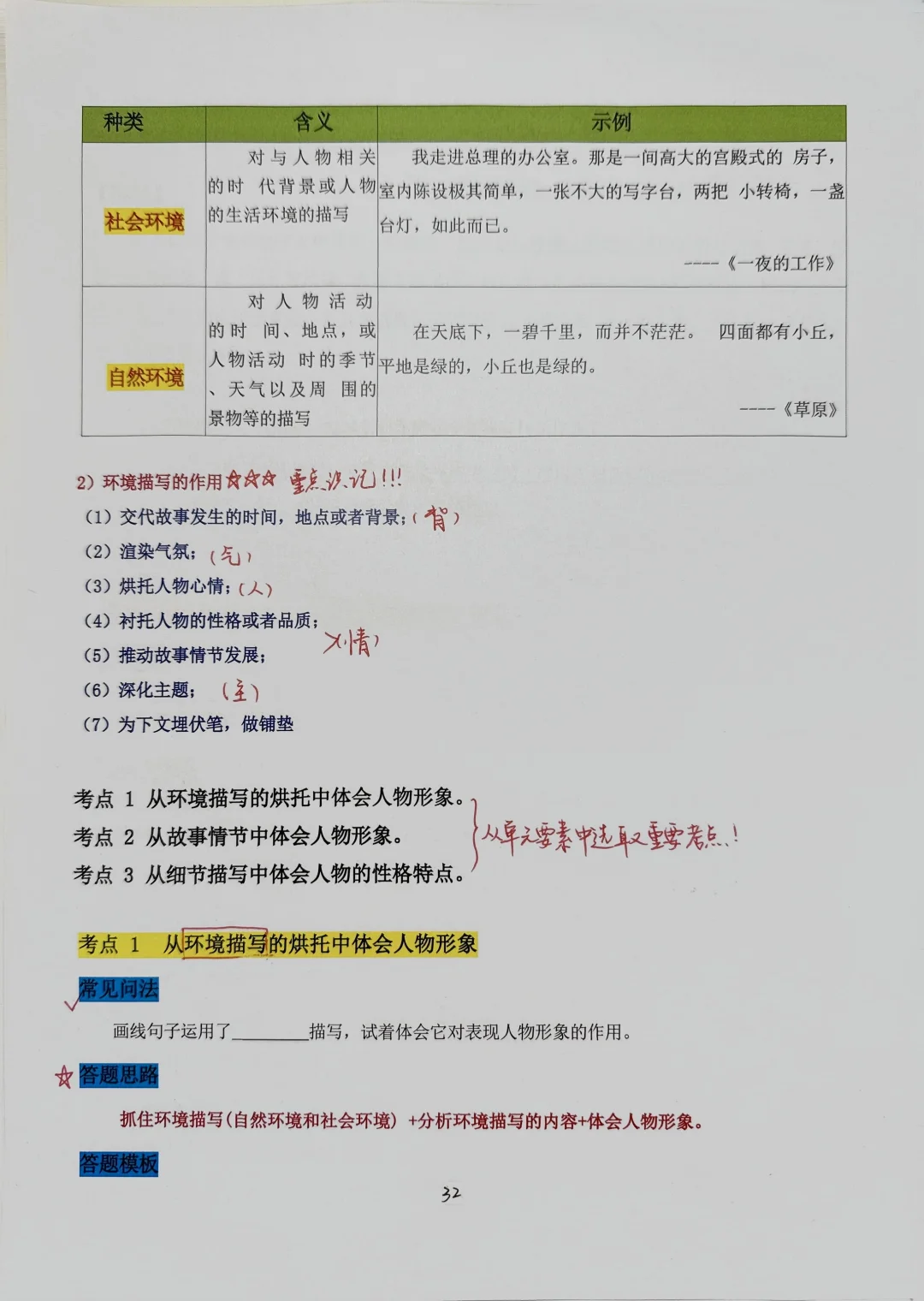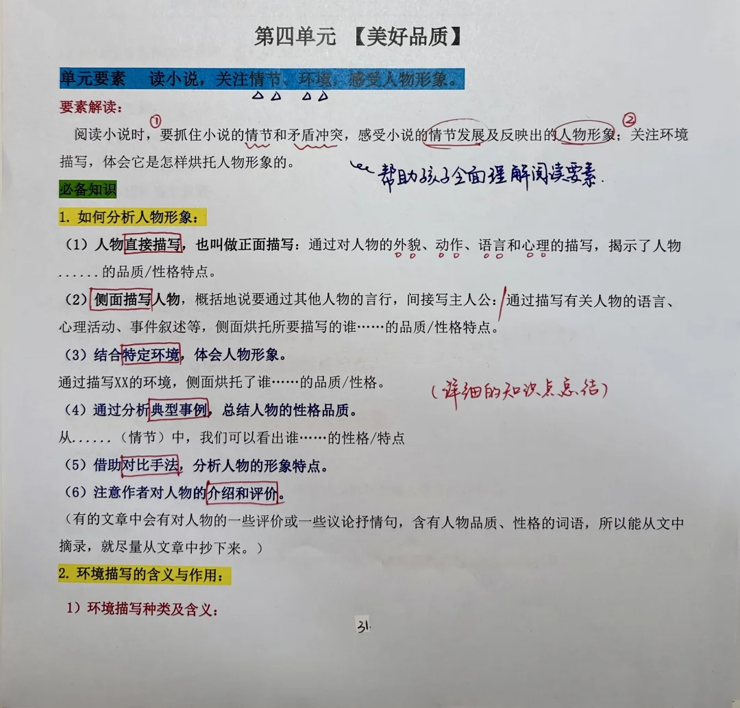 🍃第四单元单元主题:美好品质 【‼️本单元的阅读考察点主要有两个,且是重中之重,学生以前都是零散的接触零星亮点,教师正好趁这个单元去系统地给学生梳理知识点和答题模板,并通过课文中的例题帮助学生去理解性地记忆,最后来上两篇阅读【对比阅读】巩固阅读知识点!】 👉图1️⃣—4️⃣本单元阅读理解重要知识点及答题模板、例题 👉图5️⃣—8️⃣:和阅读要素匹配的阅读训练题【对比阅读】 [向右R]单元要素:读小说,关注情节、环境,感受人物形象。 [向右R]阅读必备知识点: [一R]如何分析人物形象; [二R]了解环境描写的含义和作用;【重中之重】 🔸环境描写的作用(重点识记!!!) 【口诀:背气人情主】 ①交代故事发生的时间,地点或者背景; ②渲染气氛; ③烘托人物心情; ④衬托人物的性格或者品质; ⑤推动故事情节发展; ⑥深化主题; ⑦为下文埋伏笔,做铺垫。