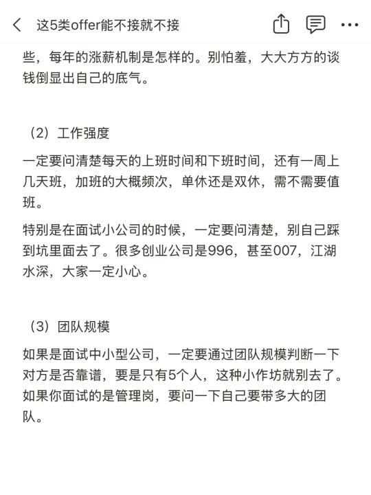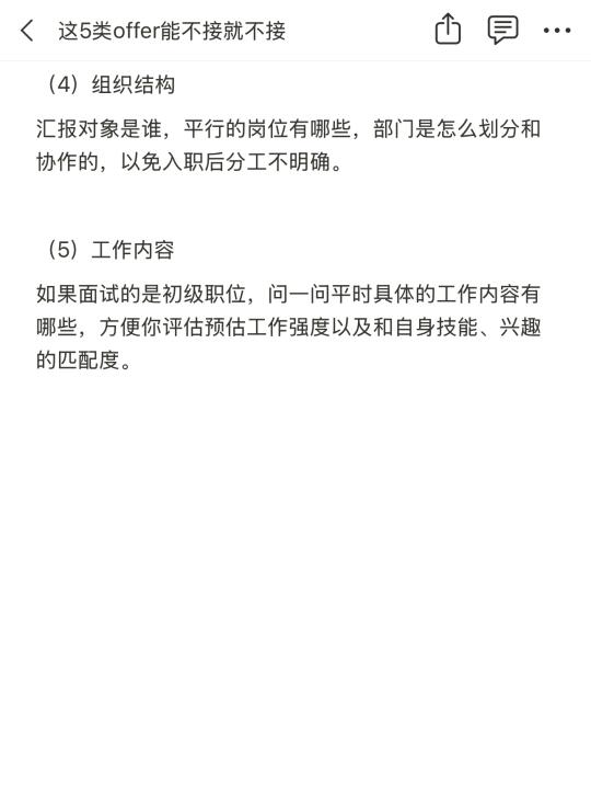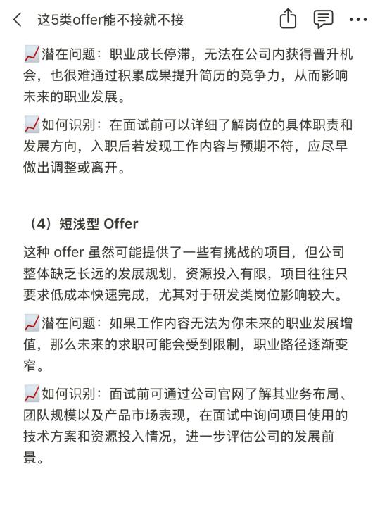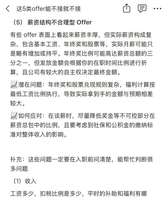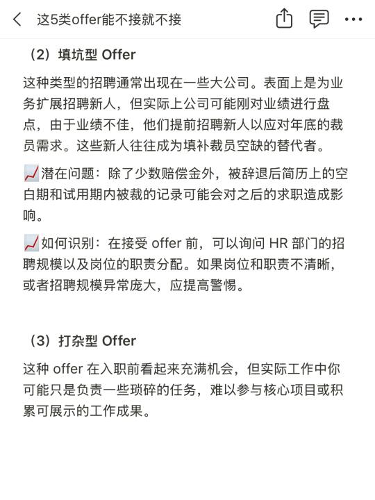 很多人都在准备年后找工作了,这篇笔记就来教大家怎么避免入职垃圾公司 总结了5类大家要谨慎的offer类型: . (1)接盘型 Offer (2)填坑型 Offer (3)打杂型 Offer (4)短浅型 Offer (5) 薪资结构不合理型 Offer 👉🏻还给大家放了一些一定要在入职前问清楚的事,能帮忙判断很多问题 . 不仅是个职场博主,分享真实有效的信息;还会不断分享成长干货,帮助大家提升自我! .