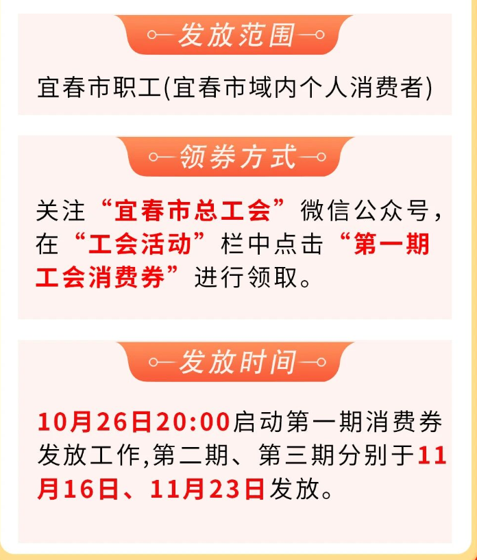 据悉,此次消费券发放活动面向宜春市全体职工(即宜春市域内的个人消费者),分三期有序开展。