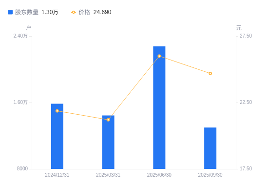 日期A股户数(户)流通A股户均持股数(股)户均持股市值(万元)2025-09-30129795024.7512.412025-06-30227622865.147.452025-03-31144444515.119.572024-12-31158464115.639.002024-09-30194073355.108.242024-06-30195823305.417.932024-03-31178193632.8710.022023-12-31122945265.5018.812023-09-30120615359.6118.112023-06-30107216029.4916.77
