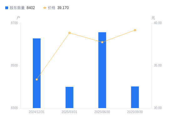 日期A股户数(户)流通A股户均持股数(股)户均持股市值(万元)2025-09-3084023865.7515.142025-06-3086573751.8814.162025-03-3184003866.6715.022024-12-3186283764.4912.562024-09-30107173030.709.612024-06-30160571245.564.022024-03-31112111783.965.012023-12-3195402096.446.742023-09-30116821712.045.902023-07-1739751503.131.89