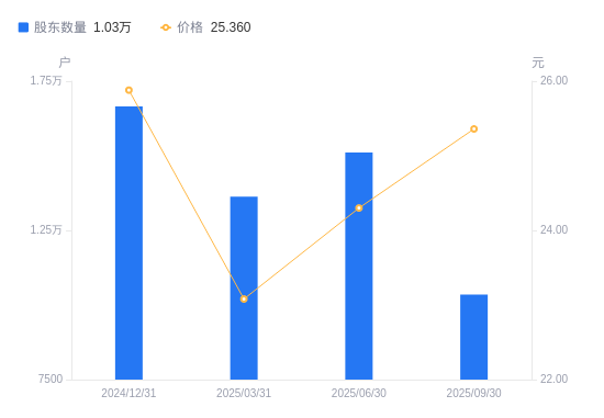 日期A股户数(户)流通A股户均持股数(股)户均持股市值(万元)2025-09-30103467296.3218.502025-06-30151064413.1410.722025-03-31136294891.4011.292024-12-31166504005.8110.372024-09-30136174797.7311.132024-06-30151404315.118.782024-03-31177103689.2010.202023-12-31138634673.8816.782023-09-30126622020.496.952023-06-30121992097.178.85
