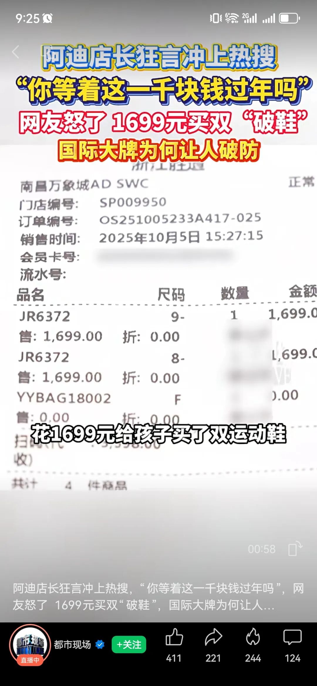 “你等着这一千块钱过年吗?”阿迪达斯南昌万象城店店长的这一句话,成功将自己送上了热搜。据江西广播电视台都市现场栏目报道,消费者郭女士在该店花1699元给孩子买了双运动鞋,结果还没走出商场,新鞋就出现了开胶问题。郭女士回到店里要求退货,不仅遭到店长拒绝,还被嘲讽“等着这一千块钱过年”。