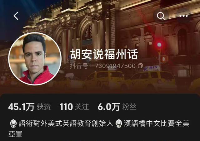胡安能讲一口流利的福州话,他在抖音开设“胡安说福州话”教网友说福州话。