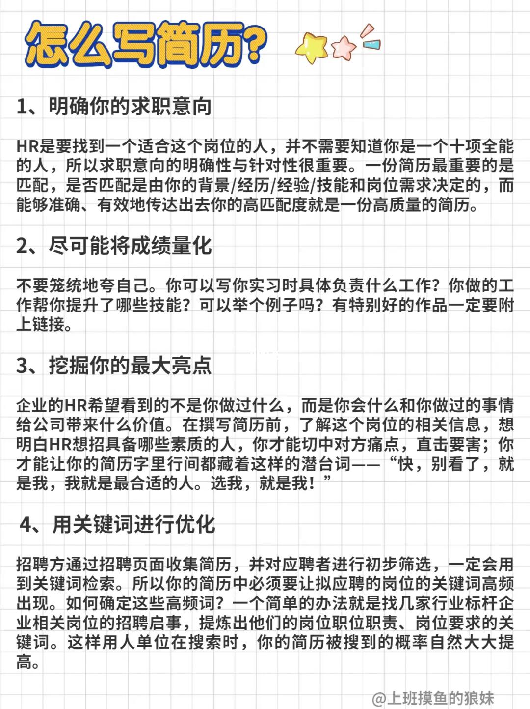 这里简略地说一下:①明确你的求职意向②尽量将成绩量化③挖掘你的最大两点④记得关键词优化