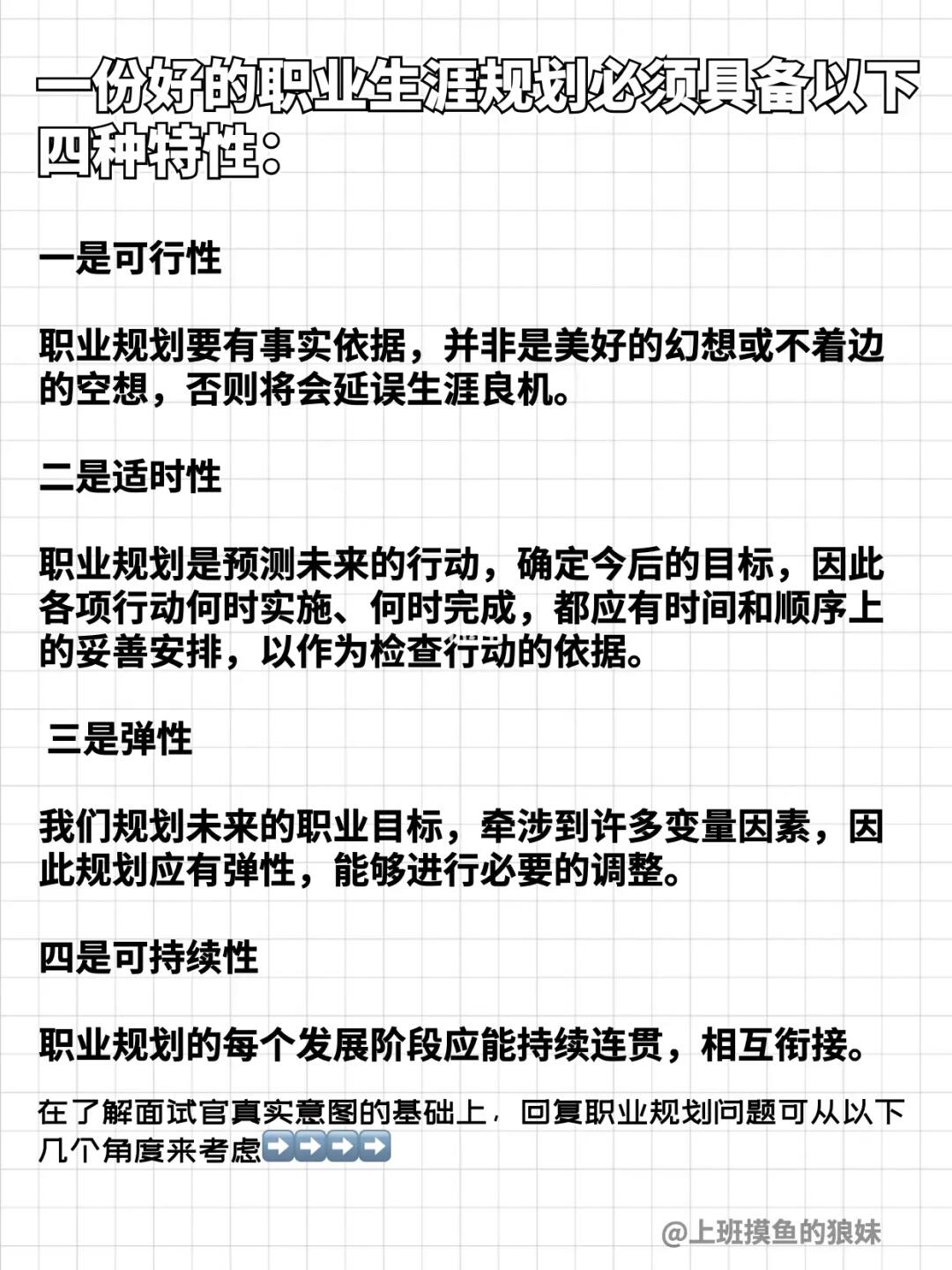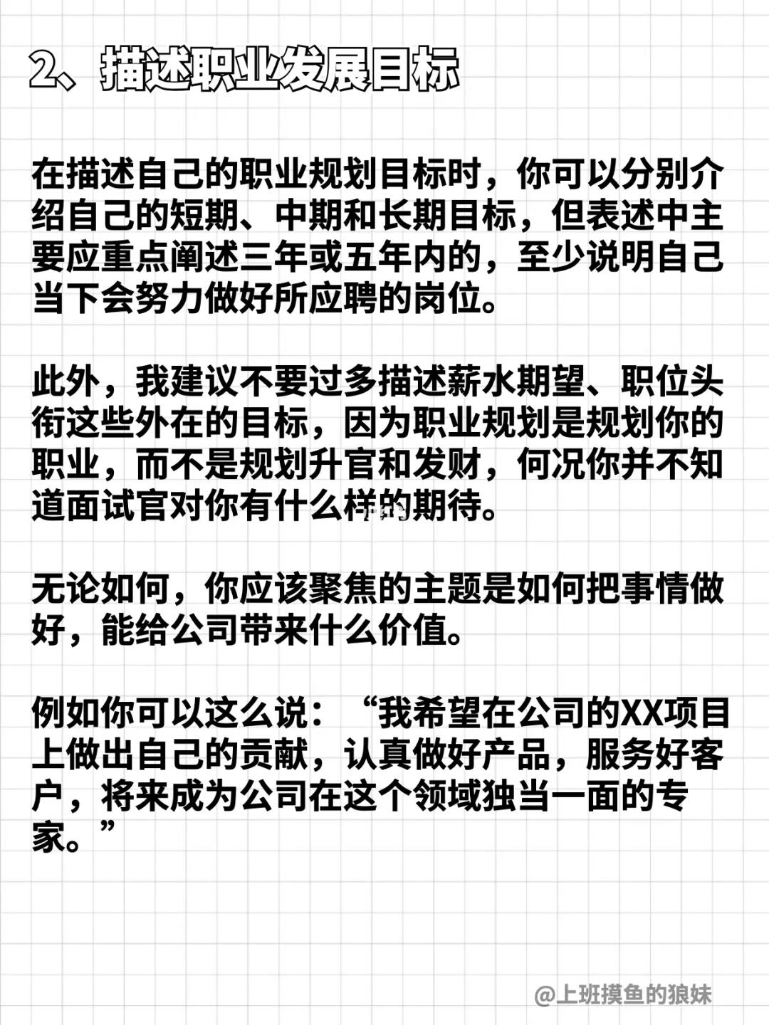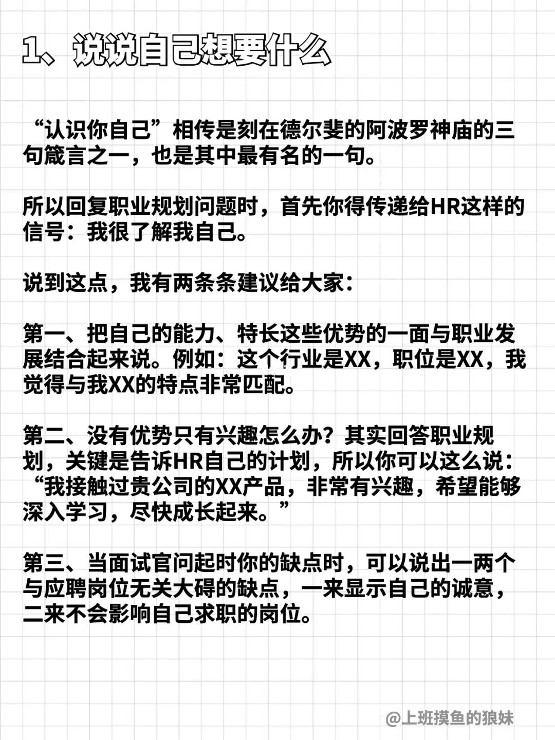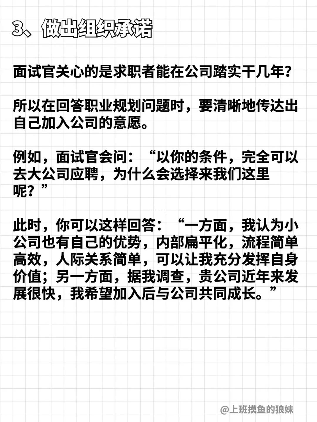之前有个粉丝问我说,我是今年刚毕业的大学生,每次去面试,HR都要问我的职业规划,其实我挺纠结的,不知道该怎么回答,总不能让我直接说“我想挣很多钱”吧? 其实,HR只是想通过这个问题,考察你对这份工作的态度。 所以建议大家从以下三个方面来回答: 👉想HR传达“我很了解我自己”这样的信息 👉做出组织承诺 👉描述职业发展目标 具体的内容图中有详解哦!