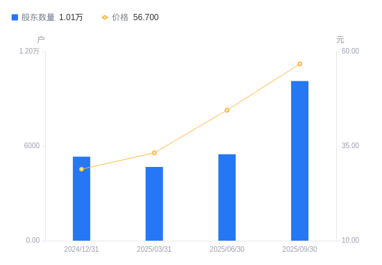 日期A股户数(户)流通A股户均持股数(股)户均持股市值(万元)2025-09-30101246243.5635.402025-06-30548011534.6451.292025-03-3146789342.5231.022024-12-3153298014.8223.152024-09-3060887015.6020.642024-06-3072595883.8715.992024-03-3183735101.048.352024-03-08124513432.735.782023-12-3187244891.899.452023-09-30100494246.888.23