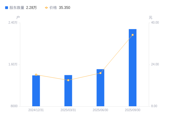 日期A股户数(户)流通A股户均持股数(股)户均持股市值(万元)2025-09-30227818924.1731.552025-06-301509913407.1727.772025-03-311396714405.9825.892024-12-311390914401.4028.902024-09-301257315931.6926.572024-06-301392414385.8923.052024-03-311364014671.6426.442023-12-311483513489.8029.962023-09-30157028279.8218.702023-06-30130939864.0721.53