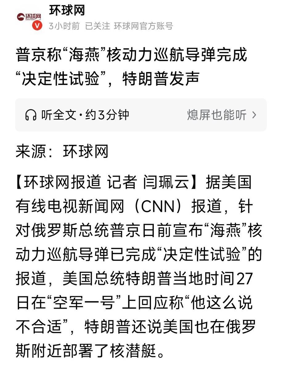原来在特朗普眼里,普京的核动力导弹等同于美国的核潜艇和导弹?普京称“海燕”核动力巡航导弹完成了“决定性试验”,特朗普则表示,我们也在进行导弹试射,还在俄罗斯附近部署了核潜艇,普京没必要这么做。 看来特朗普压根就不明白核动力导弹的含义。 对此你作何看法?