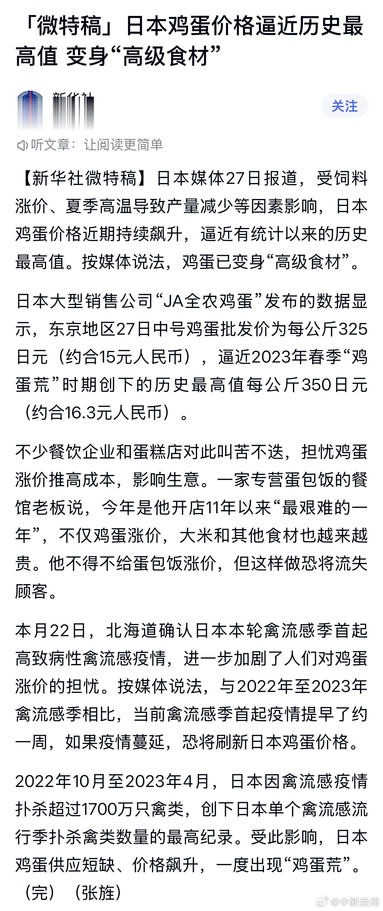 [#日本鸡蛋价格逼近历史最高值#]日本媒体27日报道,受饲料涨价、夏季高温导致产量减少等因素影响,日本鸡蛋价格近期持续飙升,逼近有统计以来的历史最高值。按媒体说法,鸡蛋已变身“高级食材”。日本大型销售公司“JA全农鸡蛋”发布的数据显示,东京地区27日中号鸡蛋批发价为每公斤325日元(约合15元人民币),逼近2023年春季“鸡蛋荒”时期创下的历史最高值每公斤350日元(约合16.3元人民币)。(新华社)