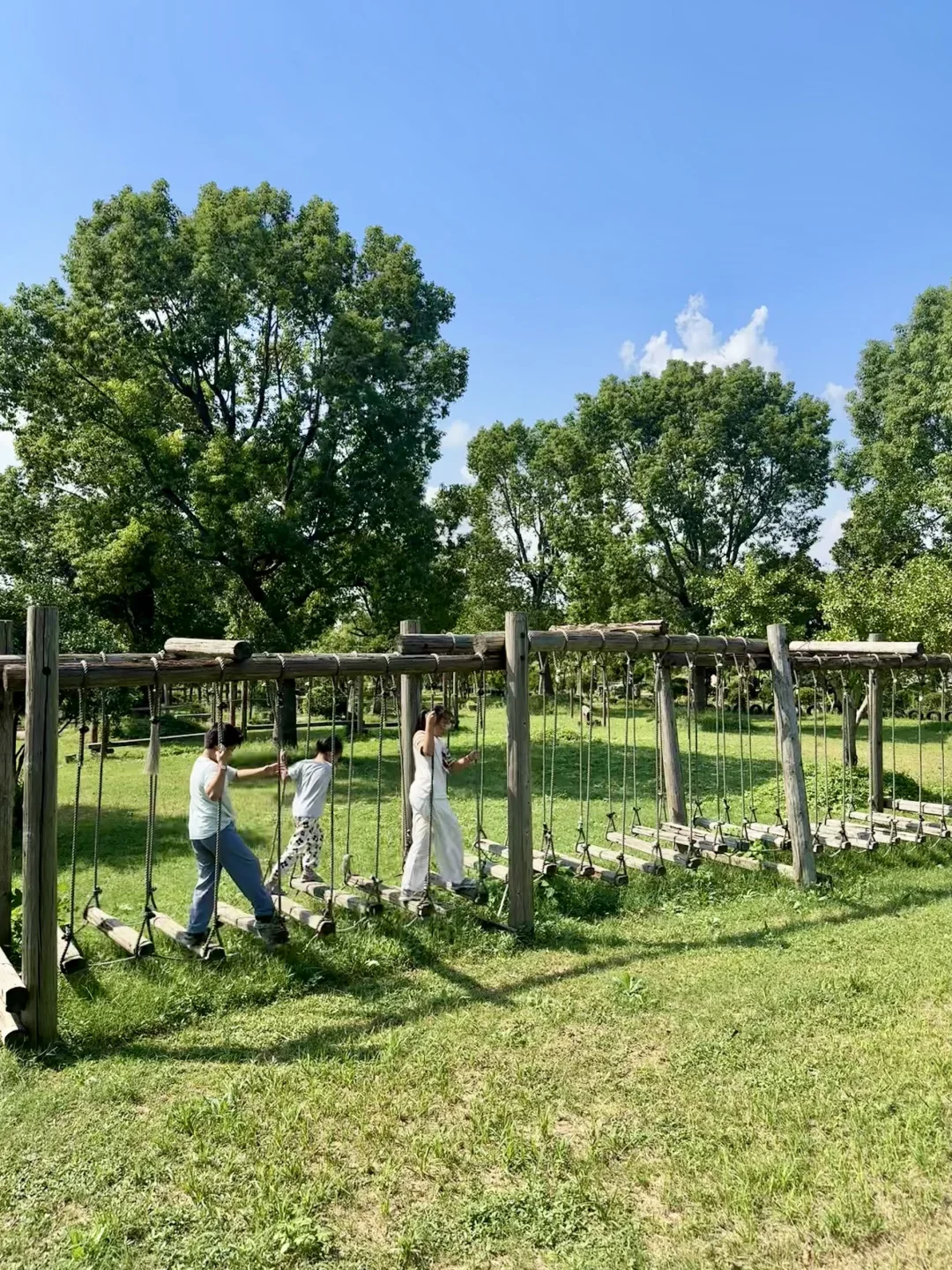 户外草坪有攀爬架,高低桩,独木桥,秋千,滑梯之类的户外设施。