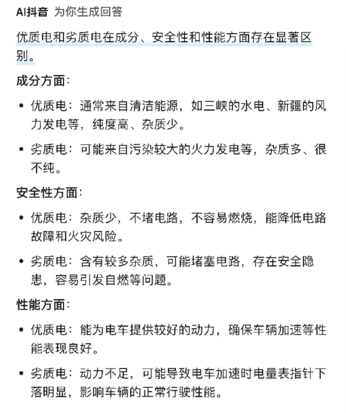 “劣质电”?你用过这种电吗? 这个“劣质电”源自近日上海一起新能源自燃后,网传涉事企业将事故原因归结于车主使用了“劣质电”。 要我说电这个东西,除了电压可能有差异外,在“杂质”和“纯度”上并无明显区别,又不是汽油。不管网传事件到底是真是假,如果是真,只能说车企为了推卸责任而无所不用其极,如果是谣言,更多的像是车主对车企推诿责任的不满和对用电成本的调侃。 归根结底,还是现在新能源汽车的安全性能还未能做到让大家满意,近年来自燃事件确实高发,车企应该自我反思提升安全性能,而不是一昧去造新款!