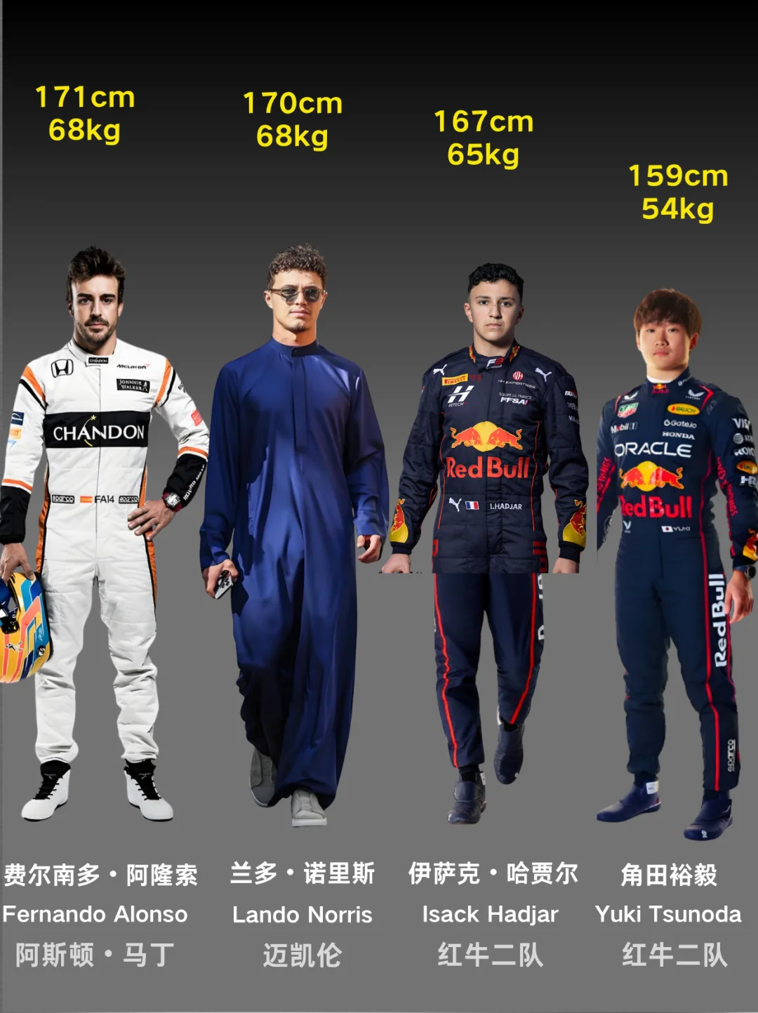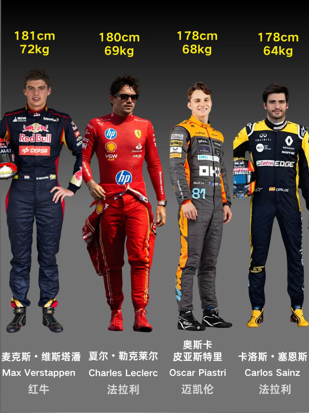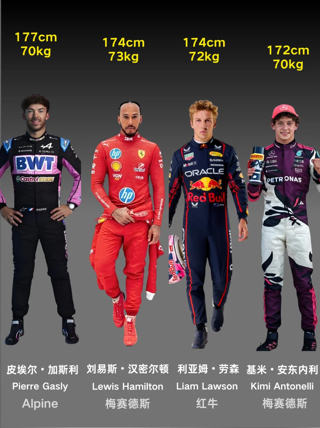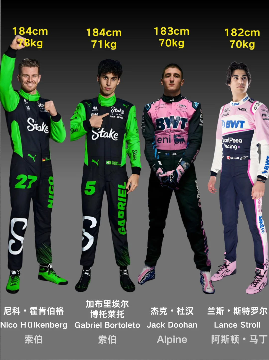 1. 埃斯特班·奥康(Esteban Ocon)- 哈斯车队,身高186cm,体重66kg 2. 亚历山大·阿尔本(Alex Albon)- 威廉姆斯车队,身高186cm,体重74kg 3. 乔治·拉塞尔(George Russell)- 梅赛德斯车队,身高185cm,体重70kg 4. 奥利弗·贝尔曼(Oliver Bearman)- 哈斯车队,身高184cm,体重68kg 5. 尼科·霍肯伯格(Nico Hülkenberg)- Kick索伯车队,身高184cm,体重78kg 6. 加布里埃尔·博托莱托(Gabriel Bortoleto)- Kick索伯车队,身高184cm,体重71kg 7. 杰克·杜汉(Jack Doohan)- Alpine车队,身高183cm,体重70kg 8. 兰斯·斯特罗尔(Lance Stroll)- 阿斯顿·马丁车队,身高182cm,体重70kg 9. 麦克斯·维斯塔潘(Max Verstappen)- 红牛车队,身高181cm,体重72kg 10. 夏尔·勒克莱尔(Charles Leclerc)- 法拉利车队,身高180cm,体重69kg 11. 奥斯卡·皮亚斯特里(Oscar Piastri)- 迈凯伦车队,身高178cm,体重68kg 12. 卡洛斯·塞恩斯(Carlos Sainz)- 法拉利车队,身高178cm,体重64kg 13. 皮埃尔·加斯利(Pierre Gasly)- Alpine车队,身高177cm,体重70kg 14. 刘易斯·汉密尔顿(Lewis Hamilton)- 梅赛德斯车队,身高174cm,体重73kg 15. 利亚姆·劳森(Liam Lawson)- 红牛车队,身高174cm,体重72kg 16. 安德烈亚·基米·安东内利(Andrea Kimi Antonelli)- 梅赛德斯车队,身高172cm,体重70kg 17. 费尔南多·阿隆索(Fernando Alonso)- 阿斯顿·马丁车队,身高171cm,体重68kg 18. 兰多·诺里斯(Lando Norris)- 迈凯伦车队,身高170cm,体重68kg 19. 伊萨克·哈贾尔(Isack Hadjar)- 红牛二队,身高167cm,体重65kg 20. 角田裕毅(Yuki Tsunoda)- 红牛二队,身高159cm,体重54kg