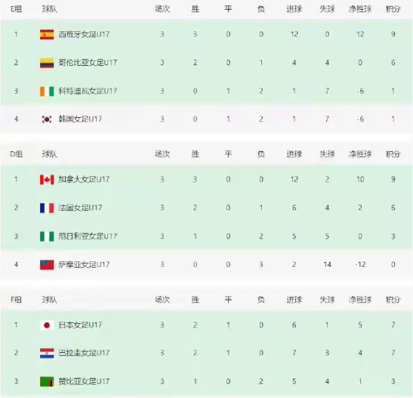 新一届U17女足世界杯小组赛最后一个比赛日,D组、F组结束的所有比赛,法国1-2输给加拿大、尼日利亚4-0大胜萨摩亚、日本1-1绝平巴拉圭、新西兰0-4惨败赞比亚。至此,各组的最终积分榜和晋级淘汰赛的球队全部出炉。 本届U17女足世界杯扩军至24支球队,分成六个小组,每组四队,除了每个小组前两名之外,还有四个成绩最好的小组第三也能出线,组成十六强淘汰赛。 D组:法国-加拿大,尼日利亚-萨摩亚 前两轮,加拿大和法国都是连胜,已经提前一轮出线,最后一轮对决将是小组头名之争。最终,加拿大2-1击败法国,三战全胜积9分锁定小组第一,法国积6分锁定小组第二。 同组另外一场比赛,尼日利亚4-0大胜萨摩亚,积3分锁定小组第三,依靠净胜球优势成为其中一个成绩最好的小组第三,成功晋级淘汰赛。 F组:日本-巴拉圭,新西兰-赞比亚 前两轮,日本和巴拉圭都是连胜,已经提前一轮出线,最后一轮对决将是小组头名之争。 最终,日本在一球落后的情况下,最后时刻1-1完成绝平,三轮不败积7分锁定小组第一,巴拉圭因净胜球落后锁定小组第二。 同组另外一场比赛,赞比亚4-0大胜新西兰,积3分锁定小组第三,依靠净胜球优势成为其中一个成绩最好的小组第三,成功晋级淘汰赛。 中国队2胜1负积6分锁定小组第二 面对打平即可出线的形势,中国女足依靠周欣怡、曾屹婕、陈睿琳、宋语的联袂破门,最终4-0大胜厄瓜多尔,锁定C组第二,成功首次晋级淘汰赛阶段,此前三次参赛(2012年、2014年、2022年)都是止步小组赛。 接下来,中国队全力备战1/8决赛,对手是巴西,这是两队首次在世界杯上对决,本场比赛将在北京时间10月28日晚上23点30分开打。 上半区:中国女足VS巴西、加拿大VS赞比亚、朝鲜VS摩洛哥、日本VS哥伦比亚 下半区:西班牙VS法国、美国VS荷兰、墨西哥VS巴拉圭、意大利VS尼日利亚