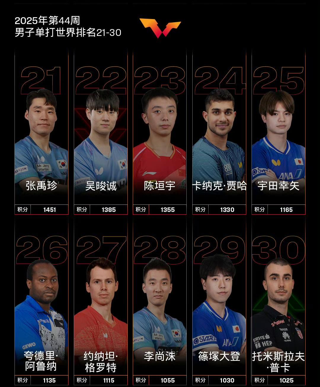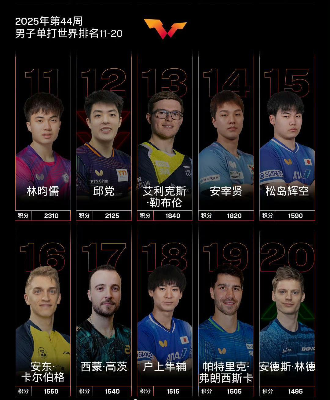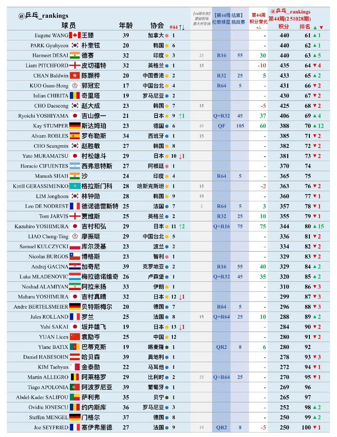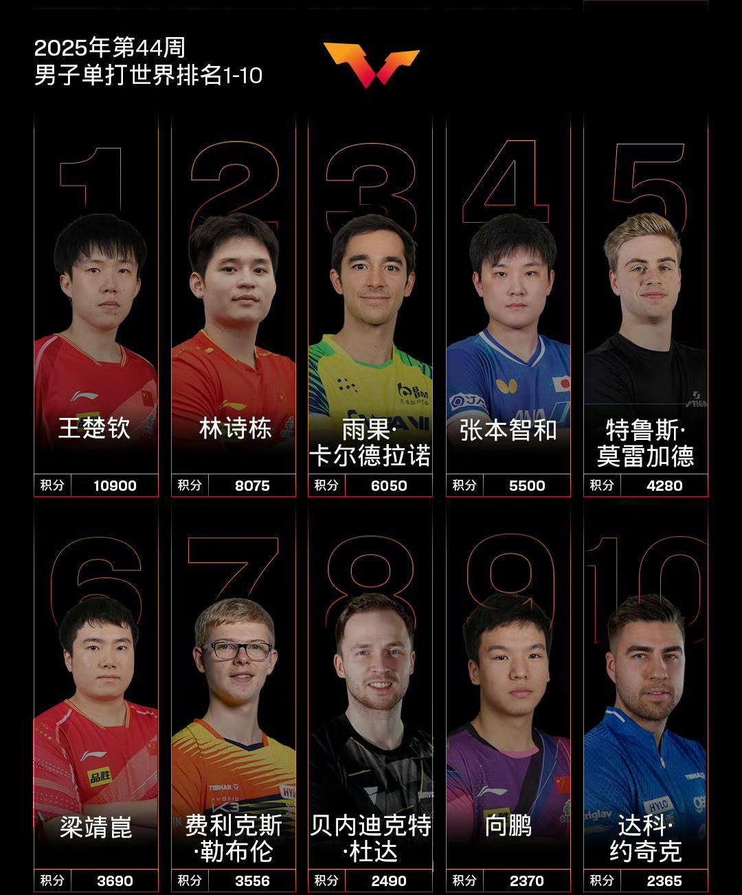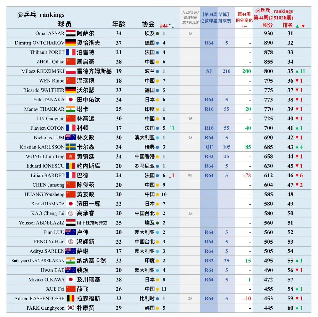 国际乒联2025年第44周男单世界排名! 本周世界排名加上了刚刚结束的2025WTT球星挑战赛伦敦站的积分,当然去年的WTT蒙彼利埃冠军赛、意大利支线赛的积分已失效。 国乒选手大头、石头依旧依次位列前二,大胖排在第六,明天晚上十一点在蒙彼利埃冠军赛上首秀的向鹏排在第九位,图图(陈垣宇)排名第23位,正在同样在蒙彼利埃参加冠军赛的温瑞博排在第36位,林高远排名掉到了第40位。