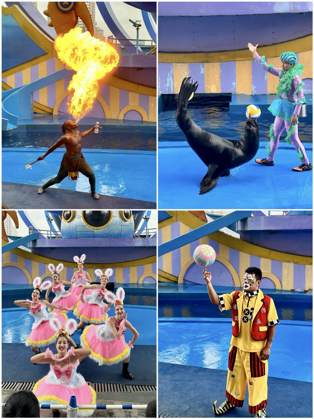 在海洋欢乐星球的科普秀是独立场馆,早一点去最好坐在第一排,方便参与现场互动(动物们在科普时会喷水很好玩,前三排可以用伞挡一下)