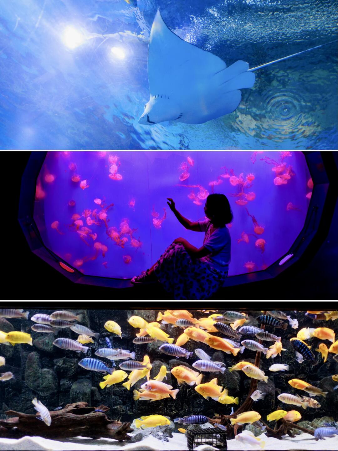 除了这些,另外还有未来水母馆,水母在各种灯光的照射下唯美又浪漫,场馆里还有一些可以互动的屏幕小游戏。