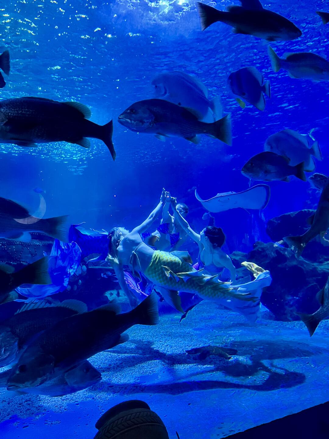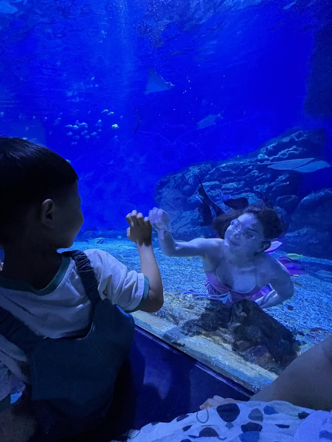 美人鱼结束马上去海底隧道蹲守,美人鱼游到我们面前比心吐泡泡,太开心啦。