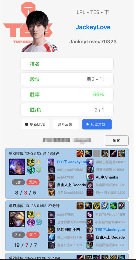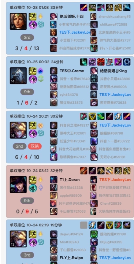 直播吧10月28日讯根据排位统计小程序显示,TES下路JackeyLove休赛期持续在峡谷之巅打Rank寻找手感,最近砍下一波五连胜,EZ打出19-7的战绩。