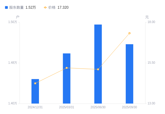 日期A股户数(户)流通A股户均持股数(股)户均持股市值(万元)2025-09-301516617075.9029.582025-06-301555312131.1818.322025-03-311498612590.1719.122024-12-311448112337.7417.572024-09-301382312925.0417.942024-06-301436012441.7014.272024-03-311516511781.2617.142023-12-311573111303.3523.692023-09-301352613207.3729.542023-06-301273713903.5234.62
