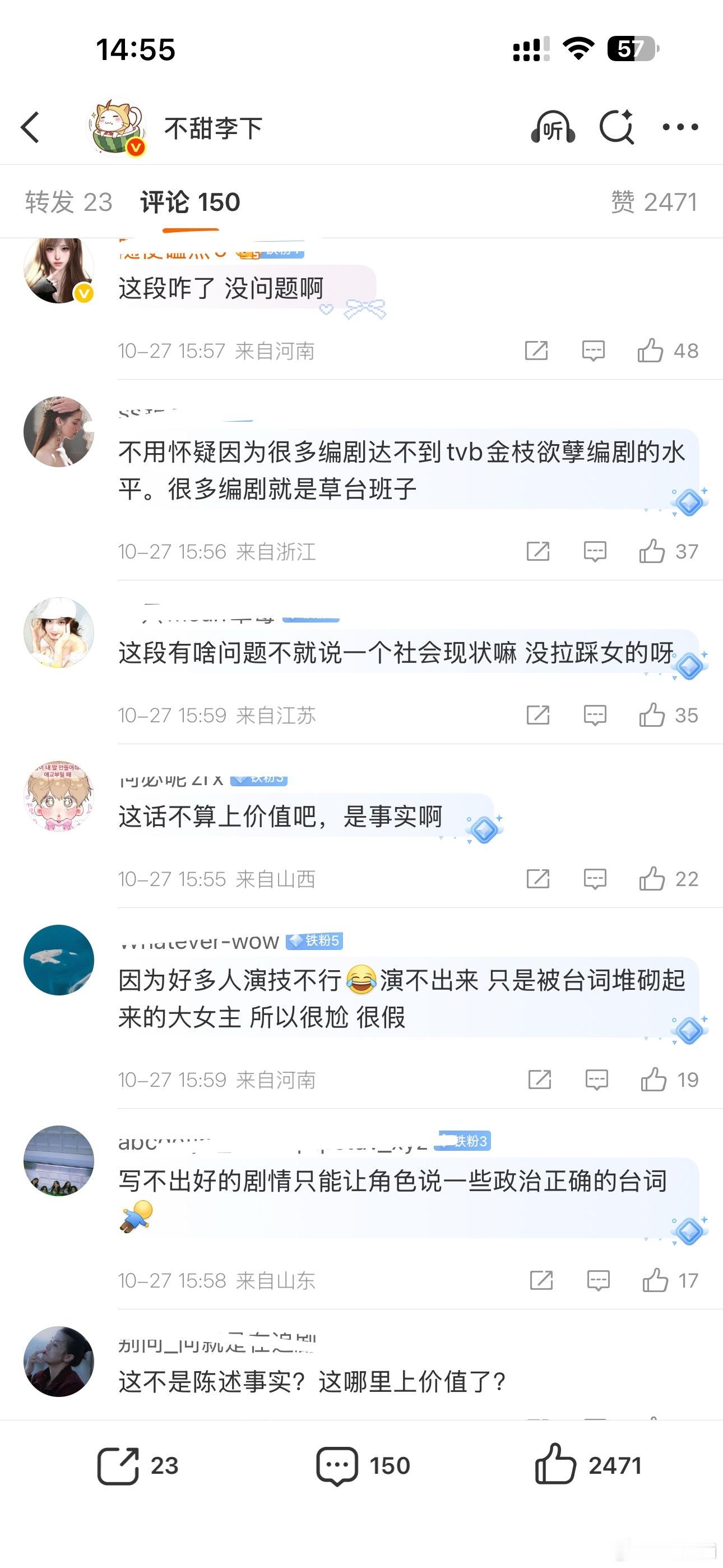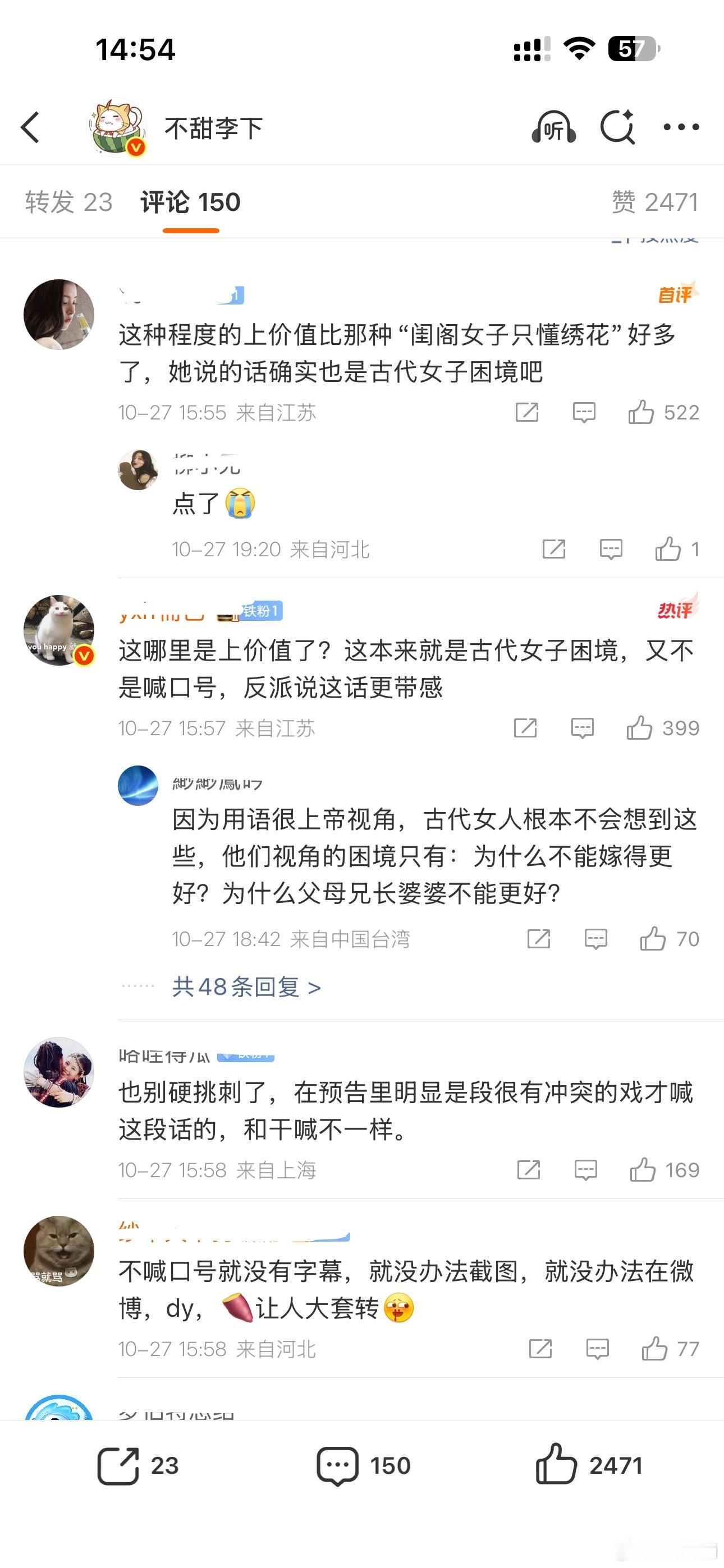 一段预告剧情没有展出找了点体现人物性格的台词就说上价值,也不知道是不是防爆,我的观点是这段台词不仅仅是封建女子的困境,还写出了她对权力的渴望,而且她说这段话也肯定不是喊口号因为是一句反问,说明已经做了被人质问动机,这人怕是预告都没看找了张截图就先批判,搞笑
