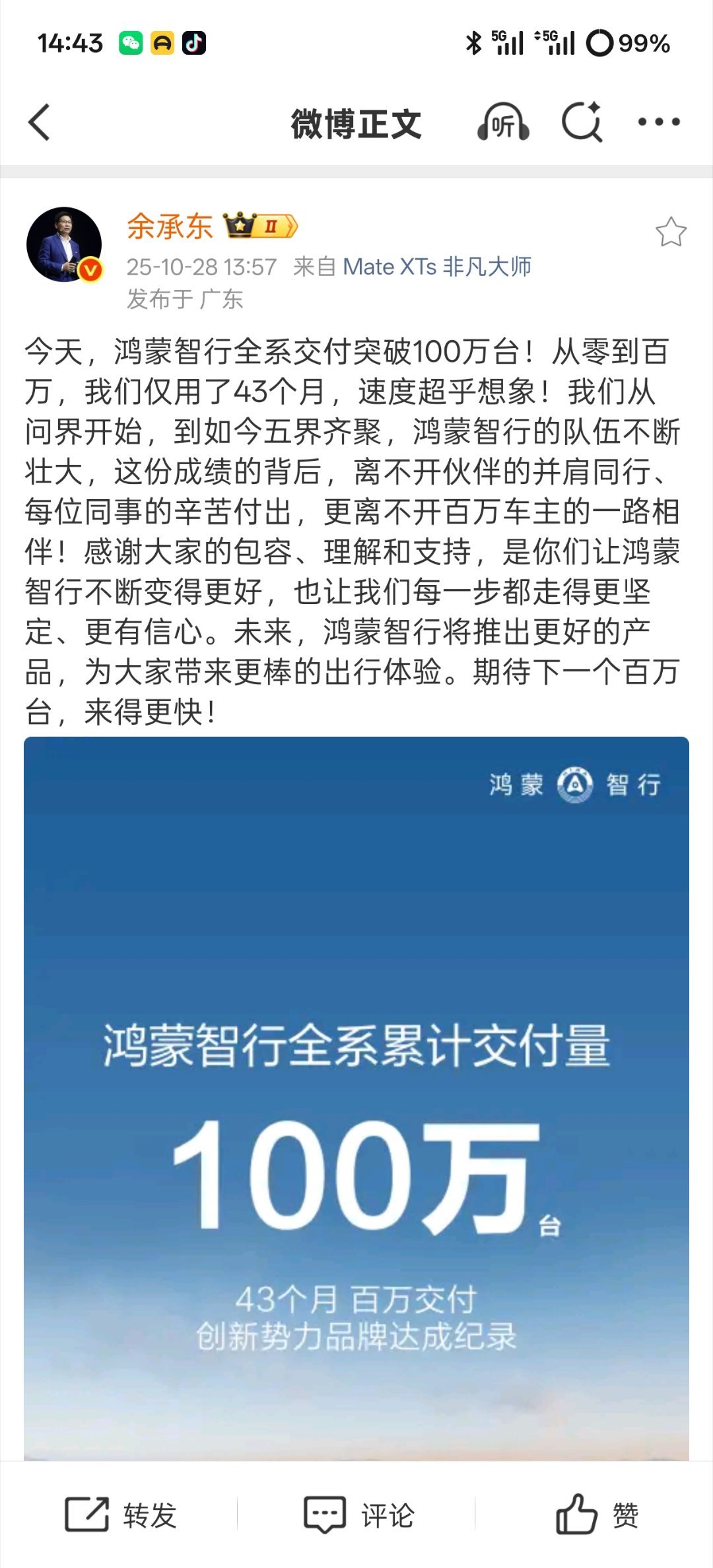 华为余承东在微博发文称,今天,鸿蒙智行全系交付突破 100 万台。