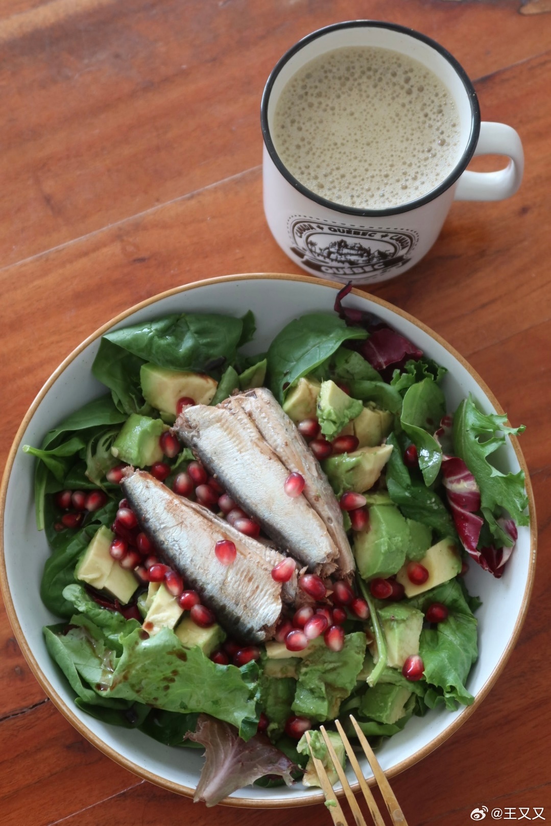 午餐:野生沙丁鱼石榴牛油果🥑沙拉🥗,沙丁鱼就是用的初榨橄榄油浸三文鱼,这个小罐头,再吃的这款有微微烟熏,超市里很好买,认准野生和初榨橄榄油就好
