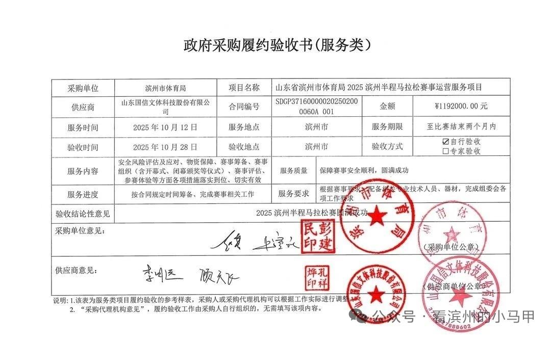 滨州“半马”履约验收!119.2万! 10月28日,《山东省滨州市体育局2025滨州半程马拉松赛运营服务项目验收公开》发布:(图一图二) 这份《政府采购履约验收书》显示,采购单位为滨州市体育局,供应商为山东国信文体科技股份有限公司,验收结论性意见为: 2025滨州半程马拉松赛圆满成功。 合同金额显示为119.2万元。 据了解,今年滨州半程马拉松赛于2025年10月12日举行,收取报名费,当日相关路段还进行了交通管制。 来源 综合滨州市公共资源交易中心