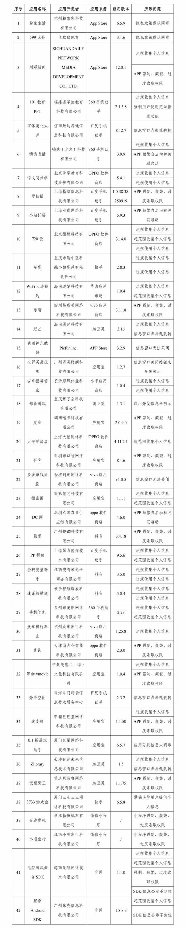 根据中央网信办、工业和信息化部、公安部、市场监管总局等四部门联合发布的《关于开展2025年个人信息保护系列专项行动的公告》,工信部对App、SDK违法违规收集使用个人信息等问题开展治理。近期,经组织第三方检测机构进行抽查,共发现42款App及SDK存在侵害用户权益行为,现予以通报。