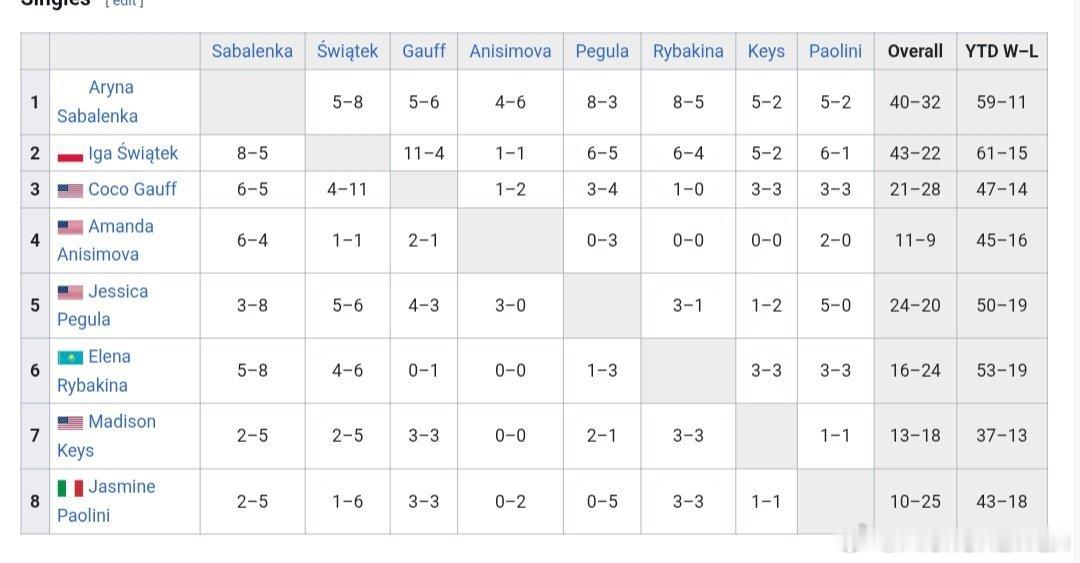 WTA总决赛抽签 来看看2025WTA总决赛8位女将的头对头[doge]以及本赛