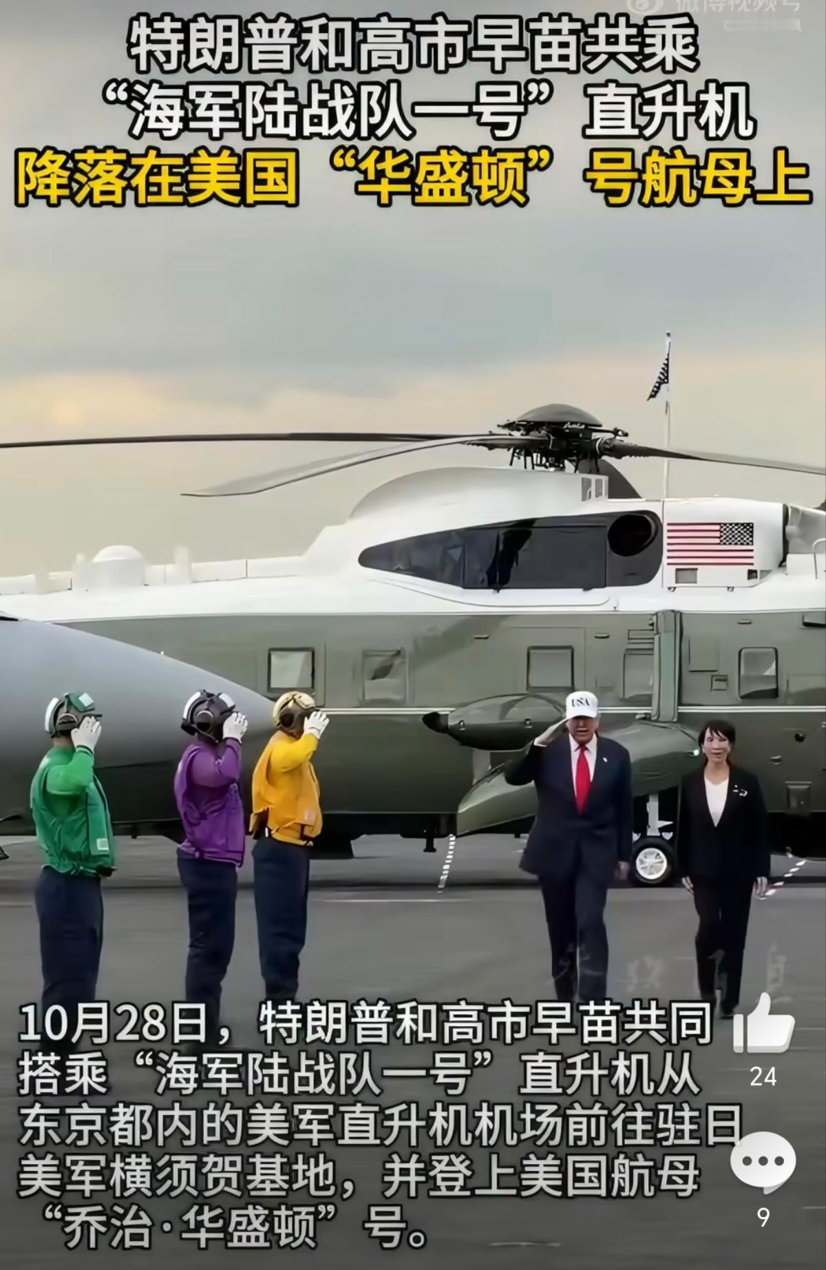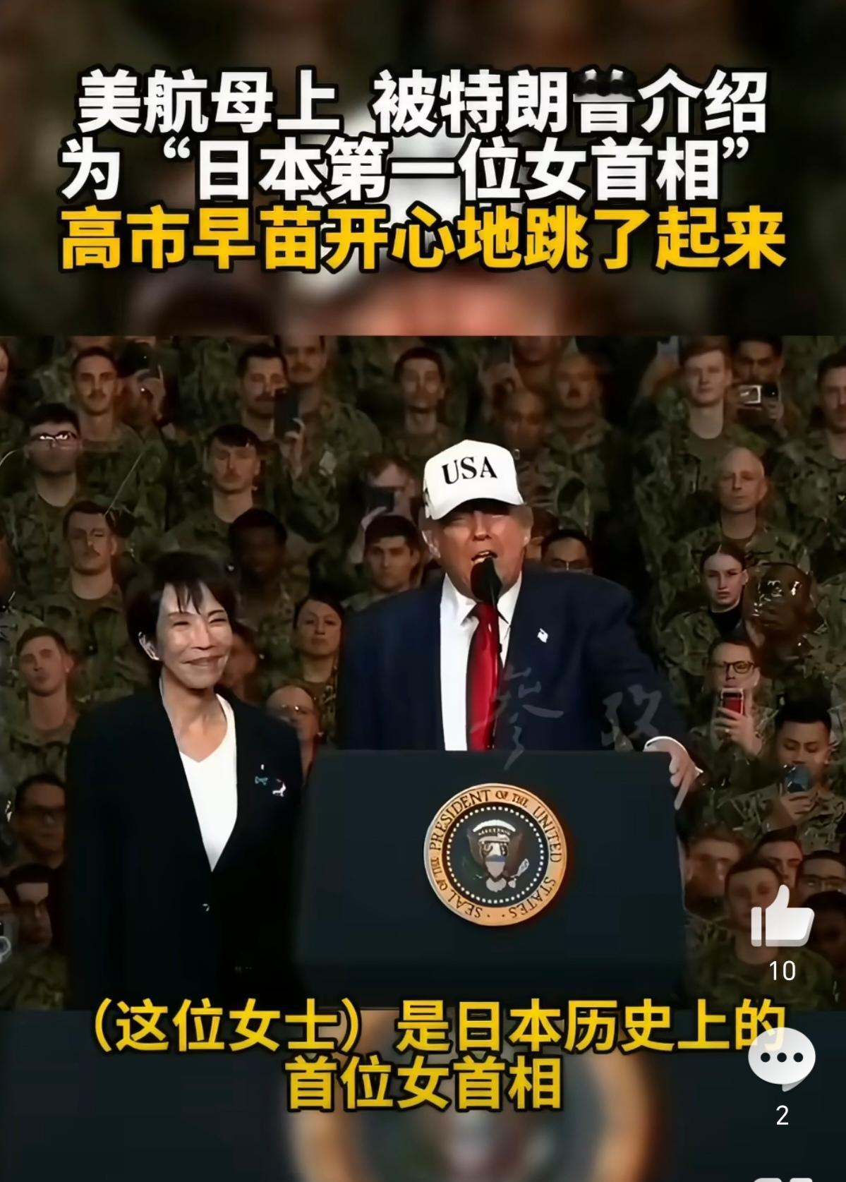 川总来了,给搞事早苗兴奋🉐手舞足蹈,老黄瓜刷绿漆,装嫩。川总邀请搞事同乘“海军陆战队一号”直升机前往驻日美军横须贺基地,并登上美国航母“乔治·华盛顿”号。 好歹也是两国元首登舰呀,弄个仪仗队表示一下欢迎呀。 川总邀请搞事一同接见美国航母上官兵,向美国大兵介绍搞事:“这位女士是日本历史上第一位女首相”,搞事听闻开心地跳了起来,一副第二春来临的样子。如果倒退20年或许还有戏,那时她44,川总59。